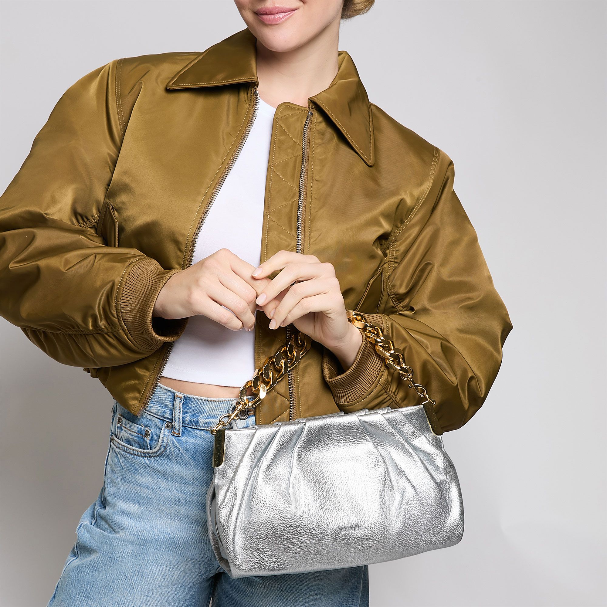 Il design compatto e la finitura metallizzata la rendono perfetta per dare luce ai tuoi look serali, aggiungendo un tocco di eleganza contemporanea.