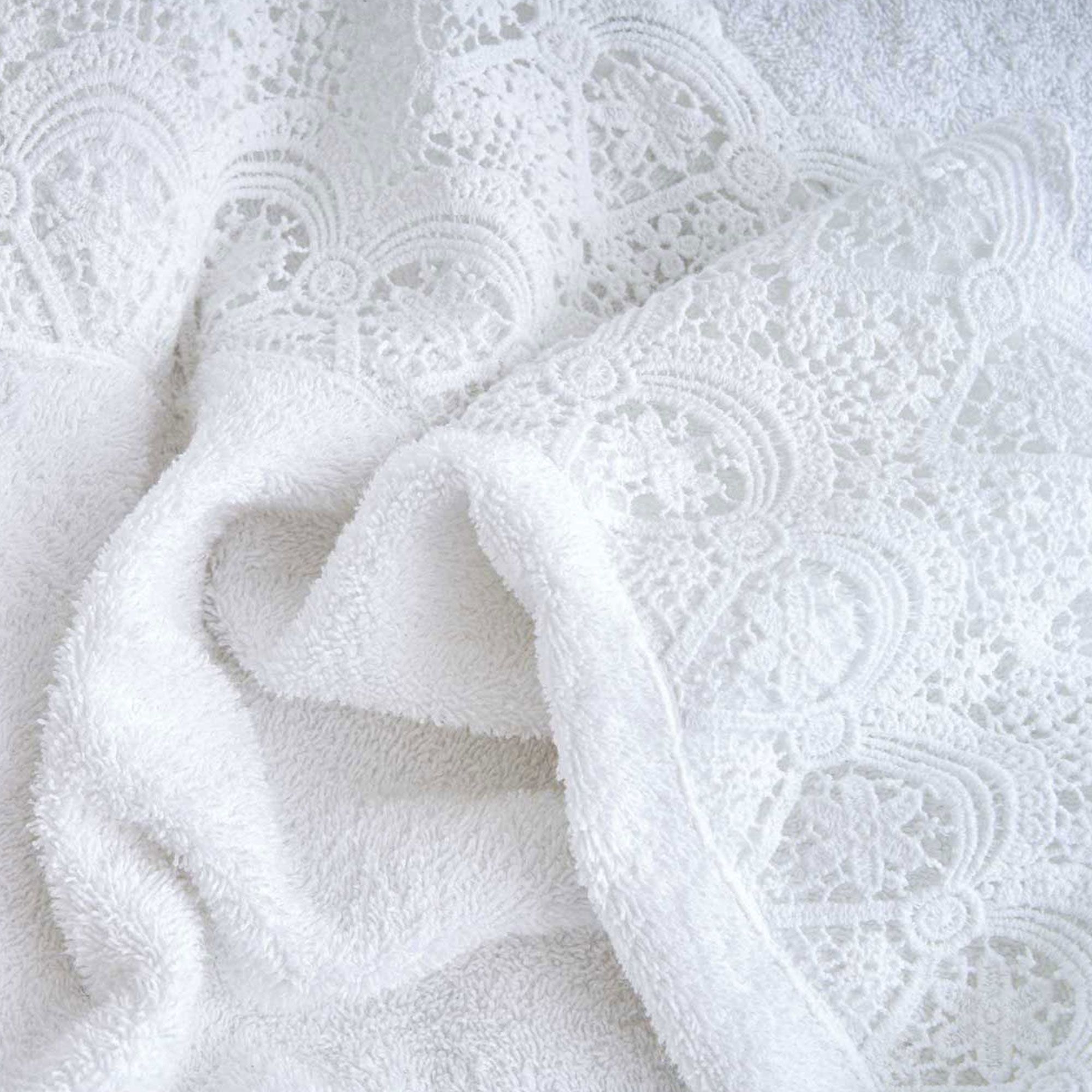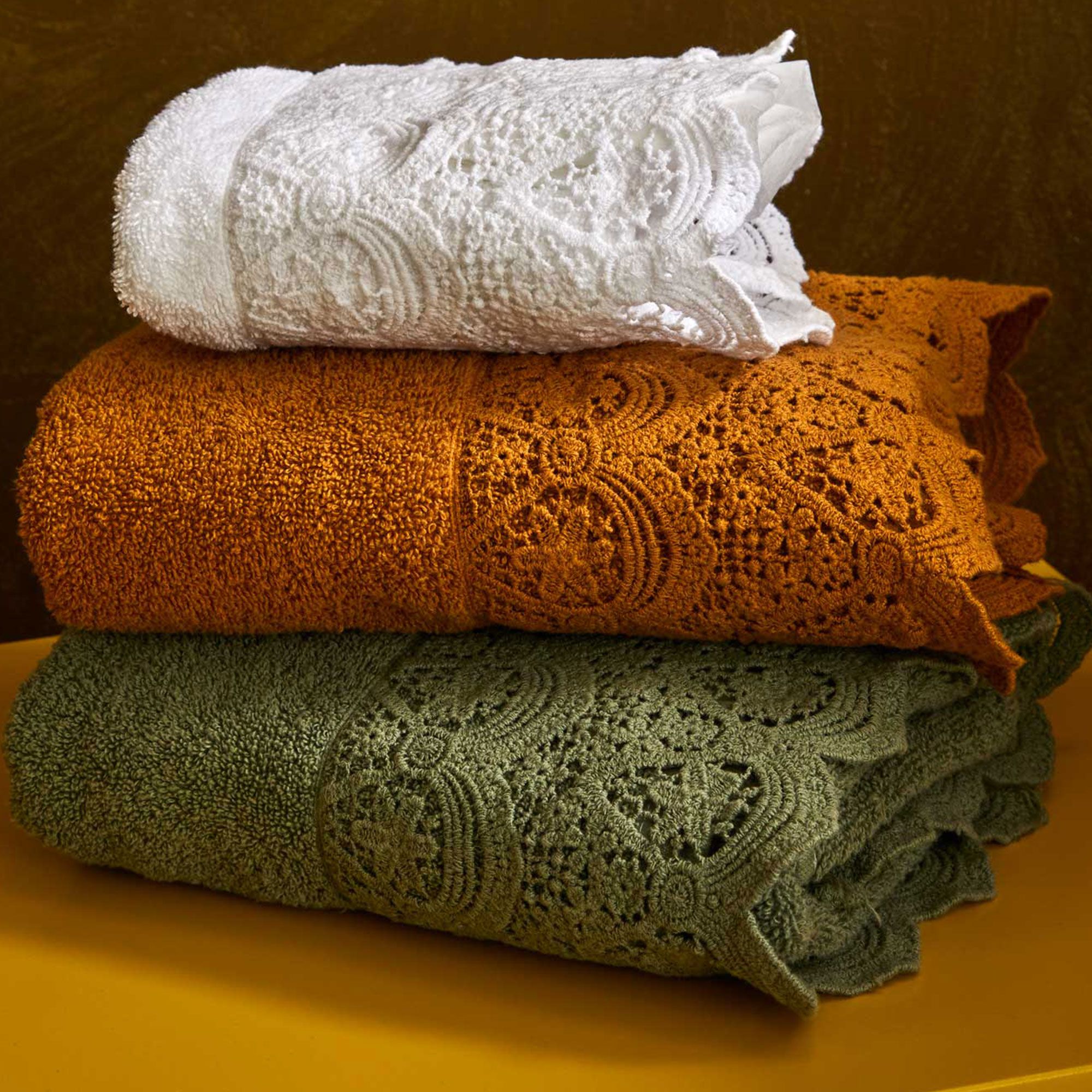 • il set unisce la morbidezza della spugna di puro cotone alla raffinatezza del pizzo macramé per un tocco elegante nel tuo bagno
