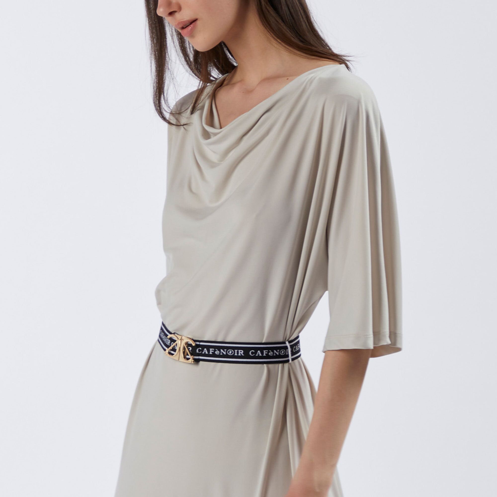 • scollatura morbida con leggero drappeggio a goccia