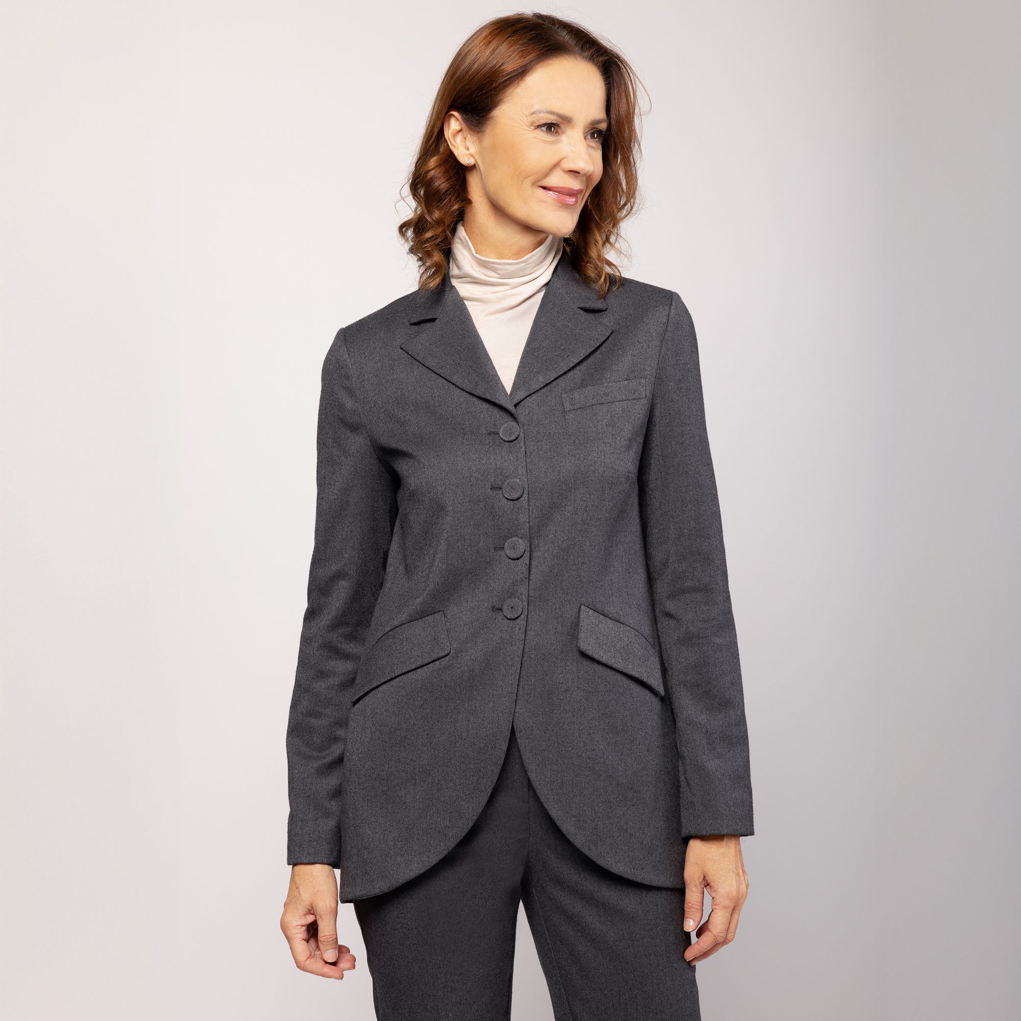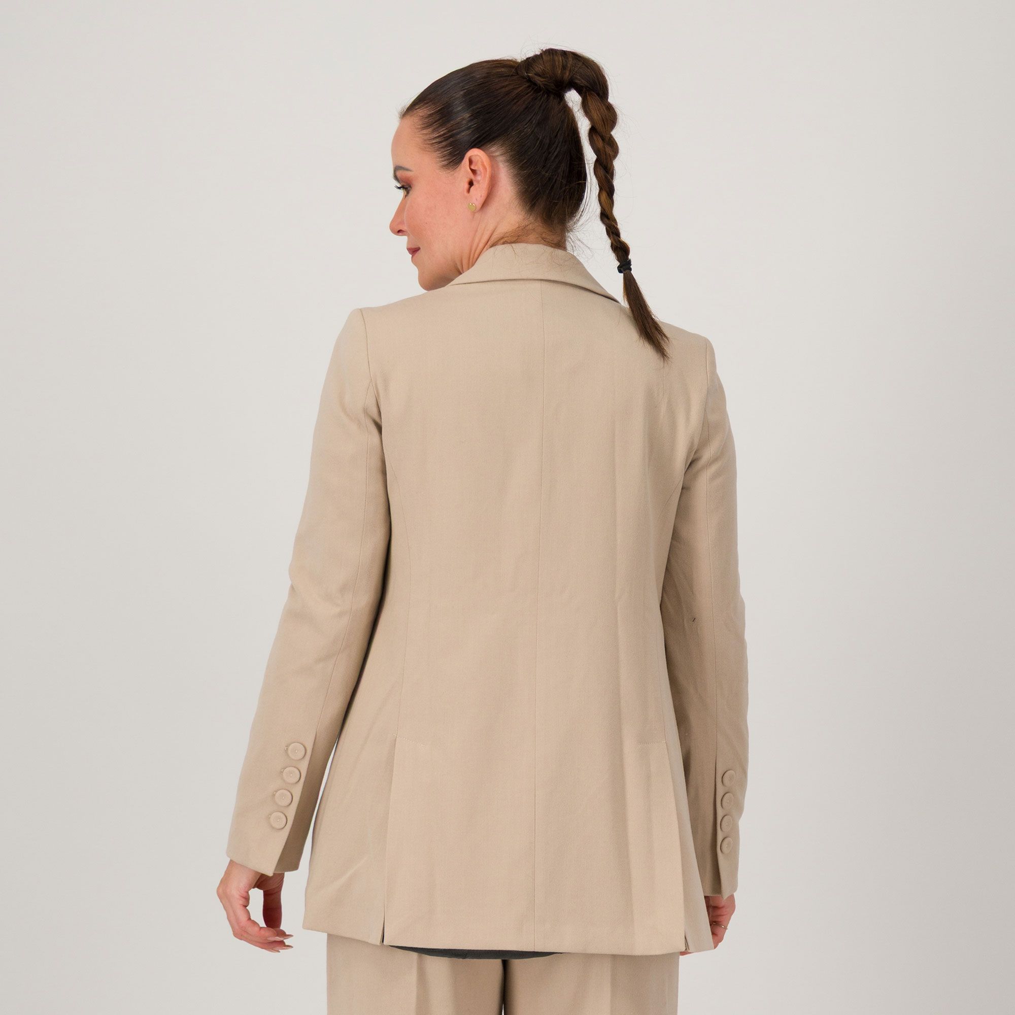 • spacco sormontato da quattro asole chiuse e bottoni rivestiti nello stesso tessuto