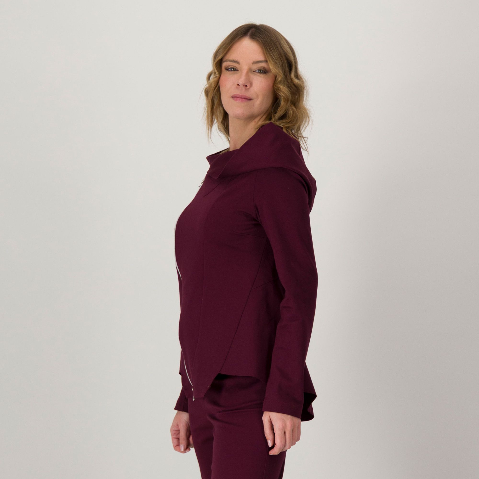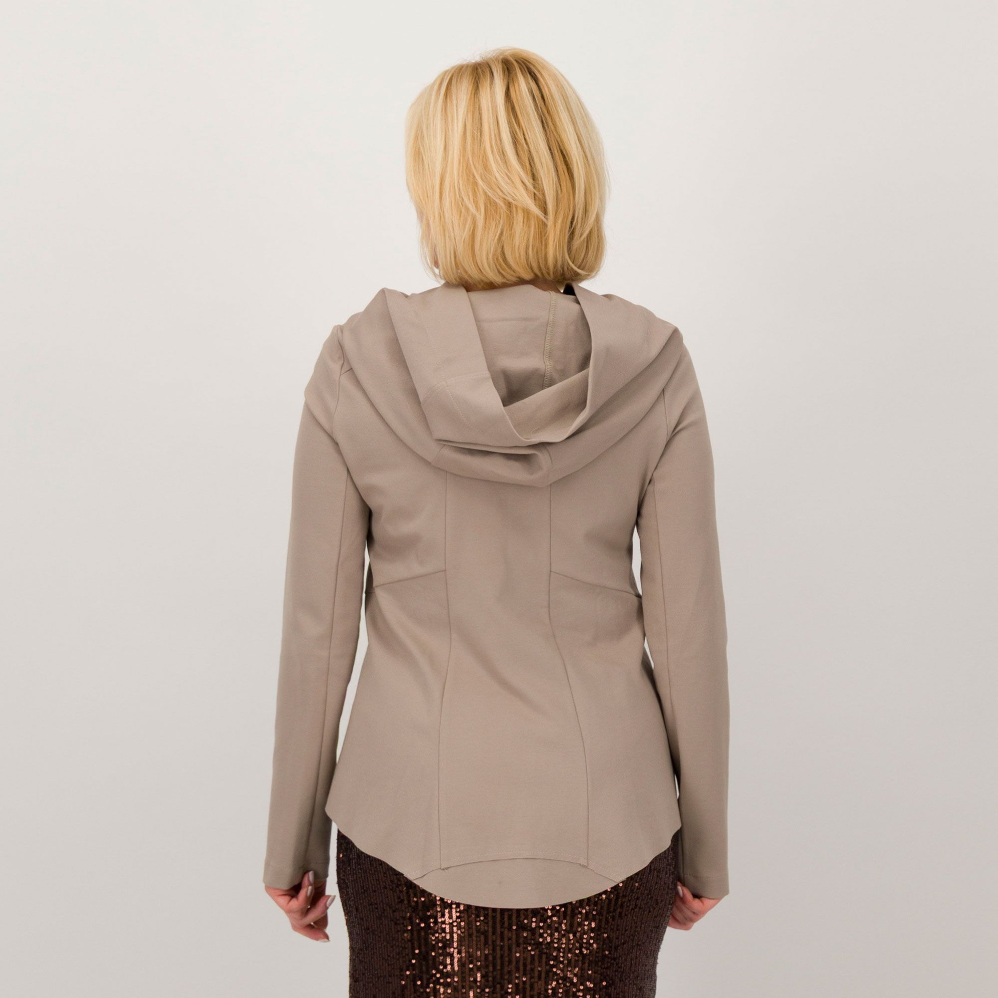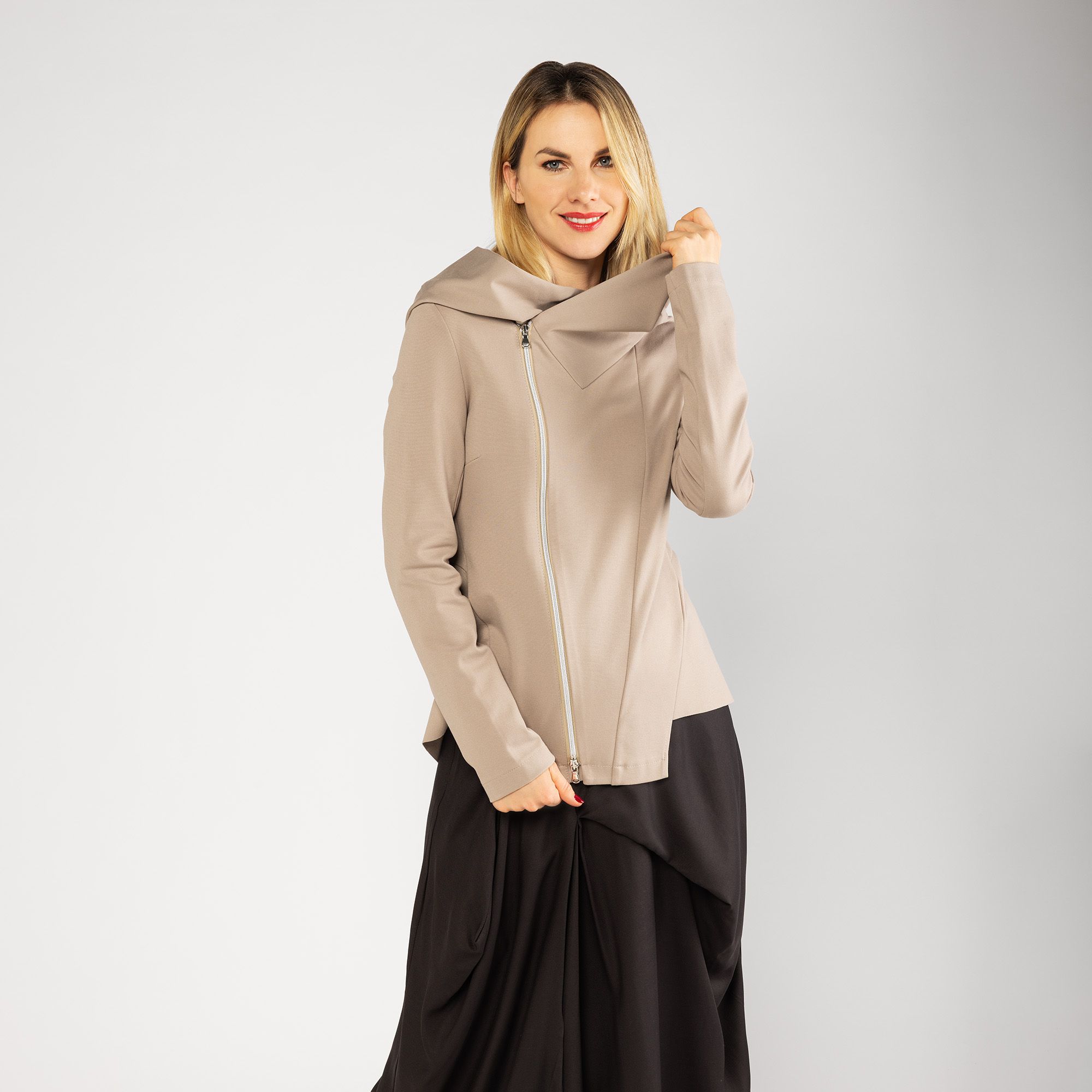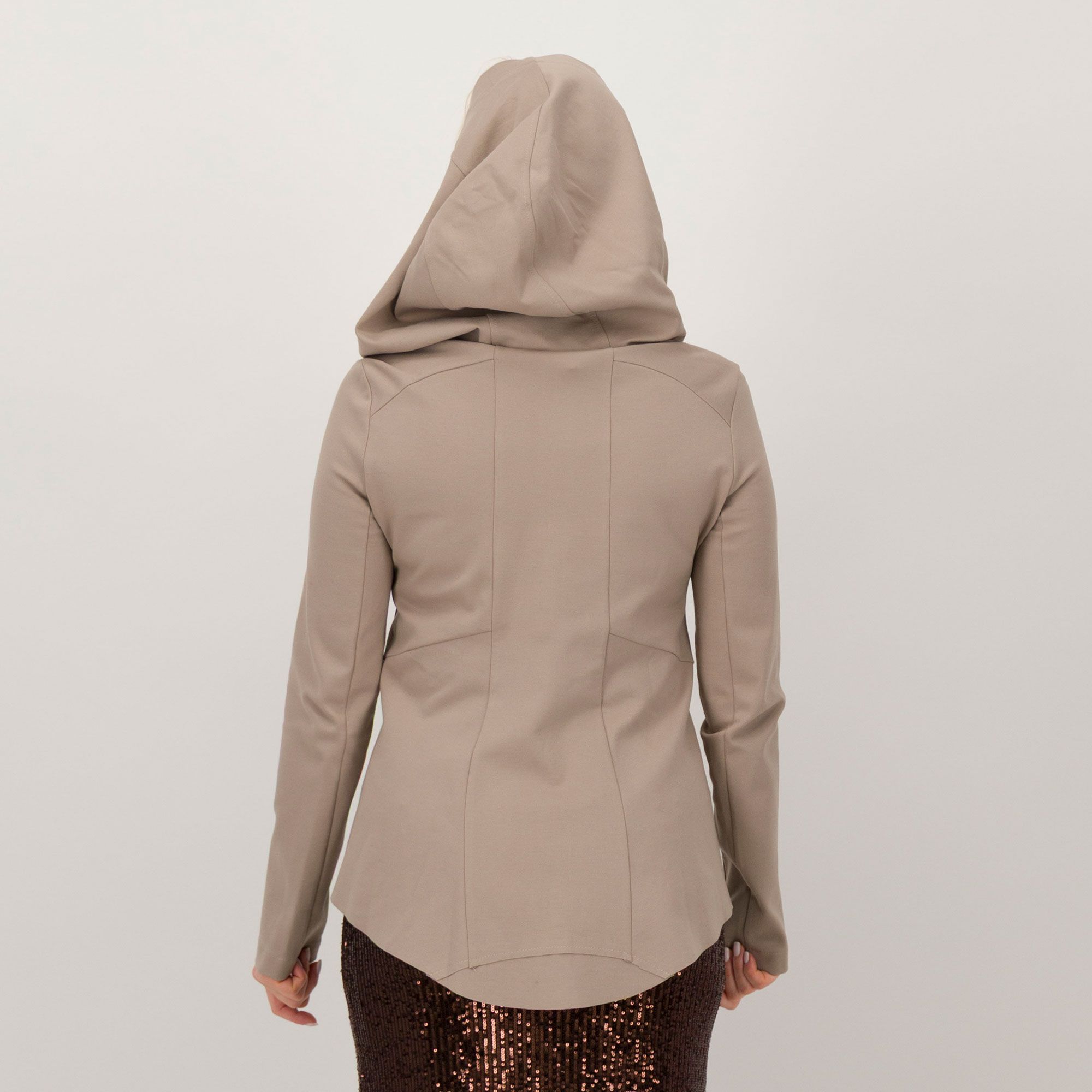 • giacca asimmetrica in punto Milano misto viscosa con cappuccio