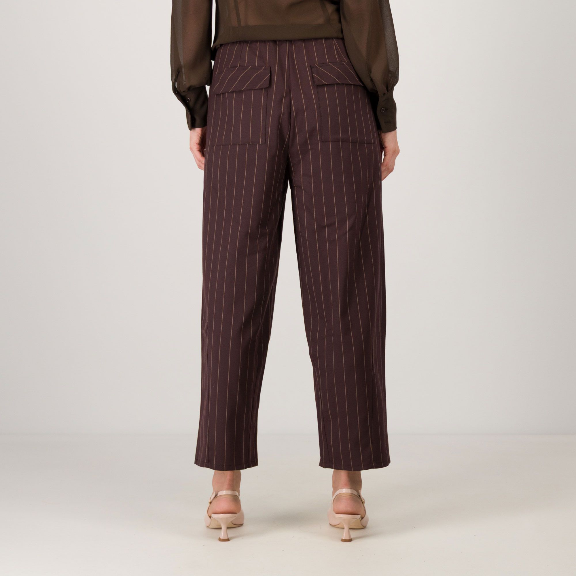 • il tessuto gessato e la linea a carota donano un tocco di classe e modernità ai tuoi look