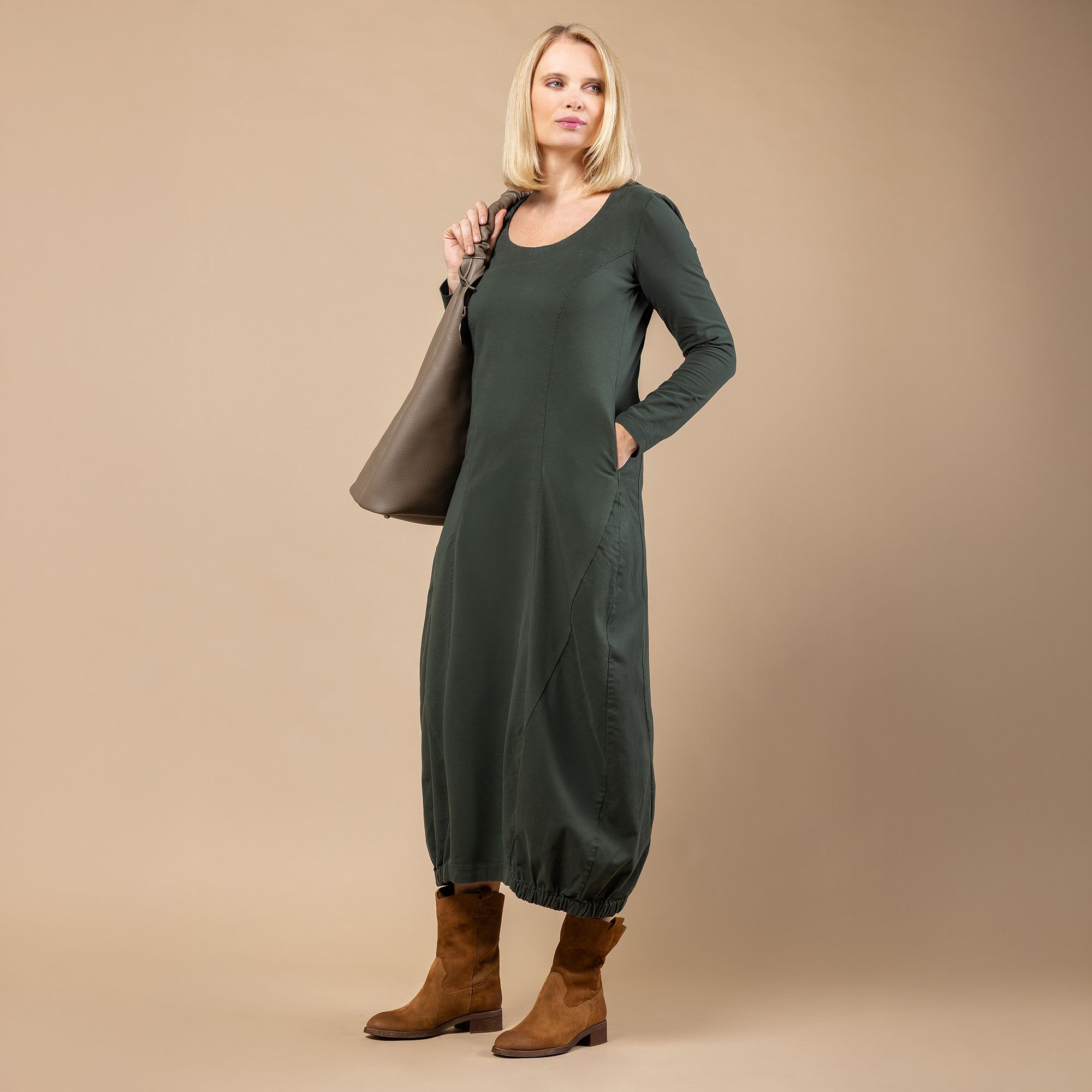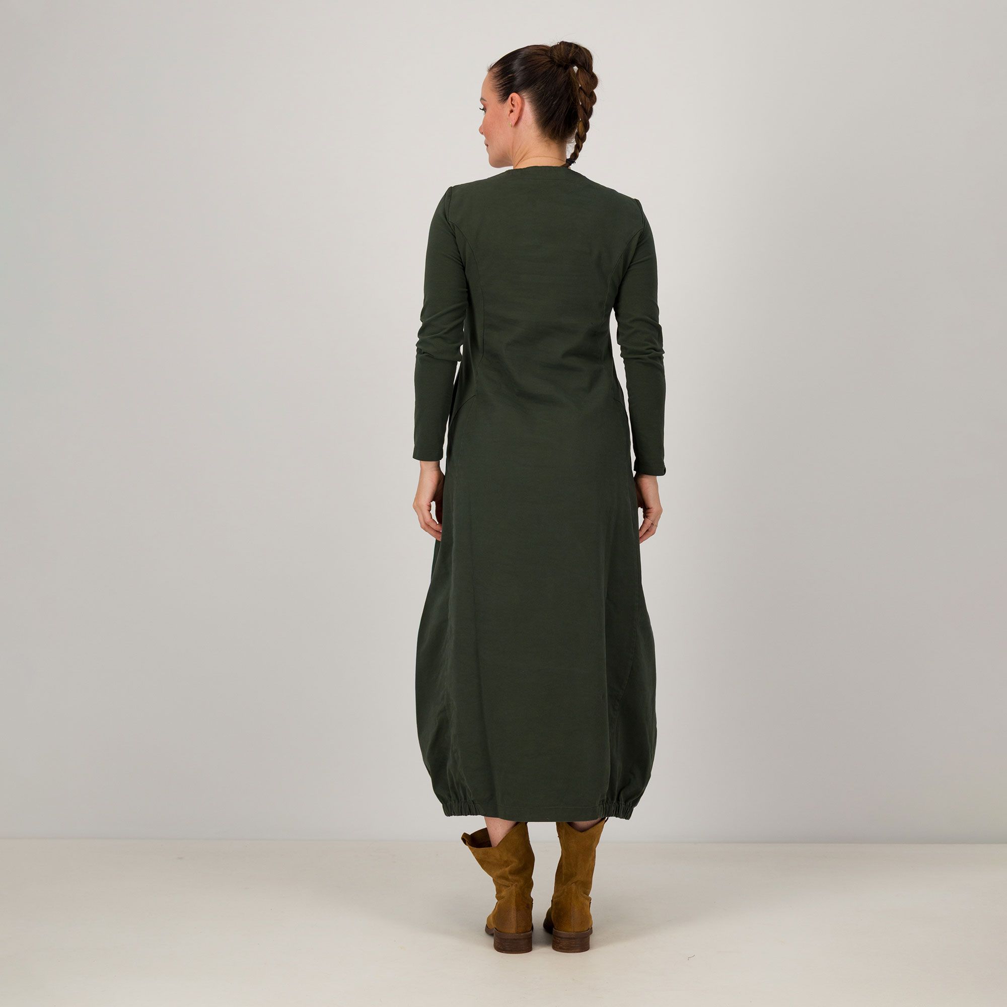 • abito lungo in tessuto di raso smerigliato con inserti in felpina di cotone stretch