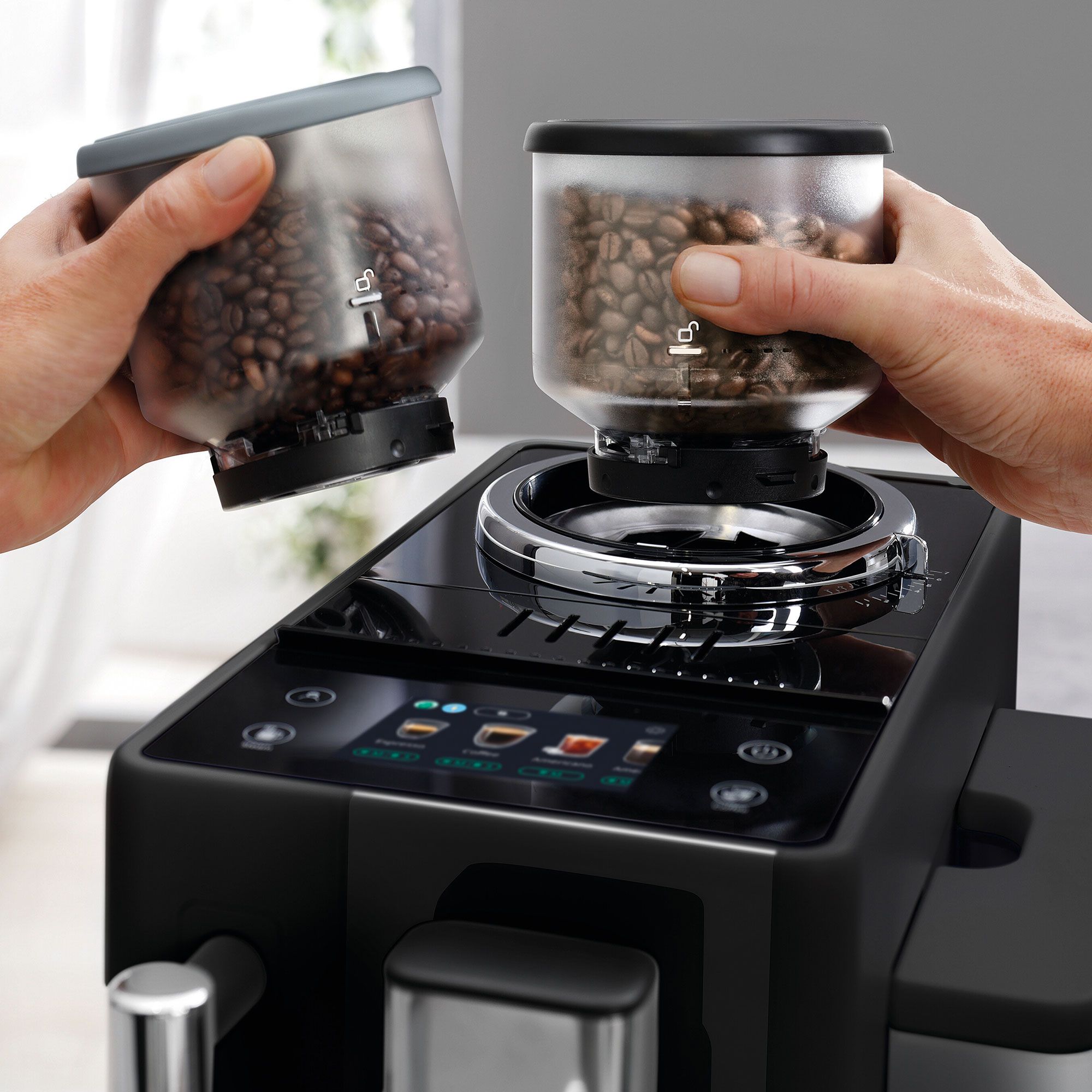 • puoi alternare facilmente tra due tipi di chicchi grazie al Bean Switch System