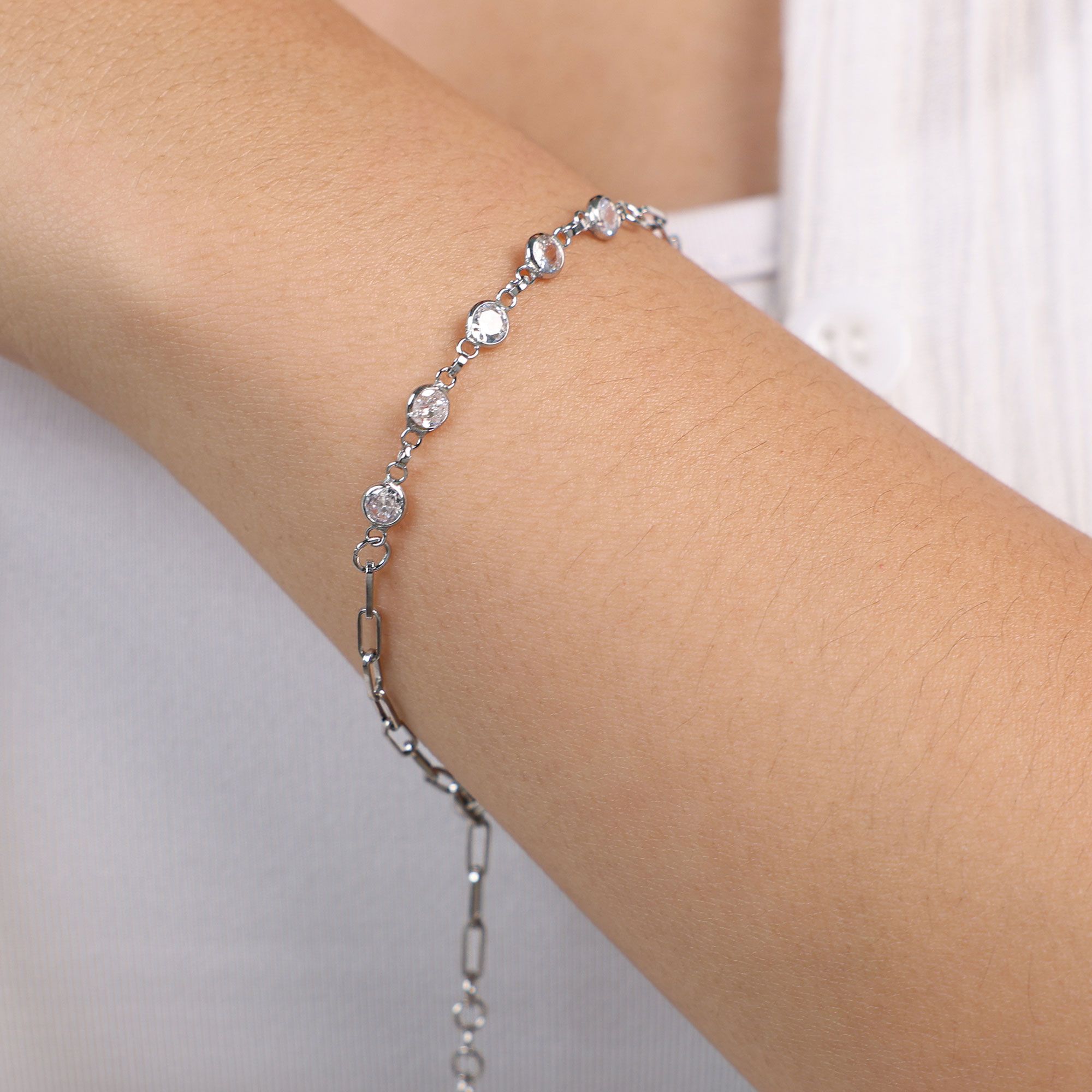 Il bracciale illumina il polso con la brillantezza dei diamonique e il design contemporaneo, perfetto per aggiungere un tocco sofisticato sia ai look quotidiani che alle occasioni speciali.