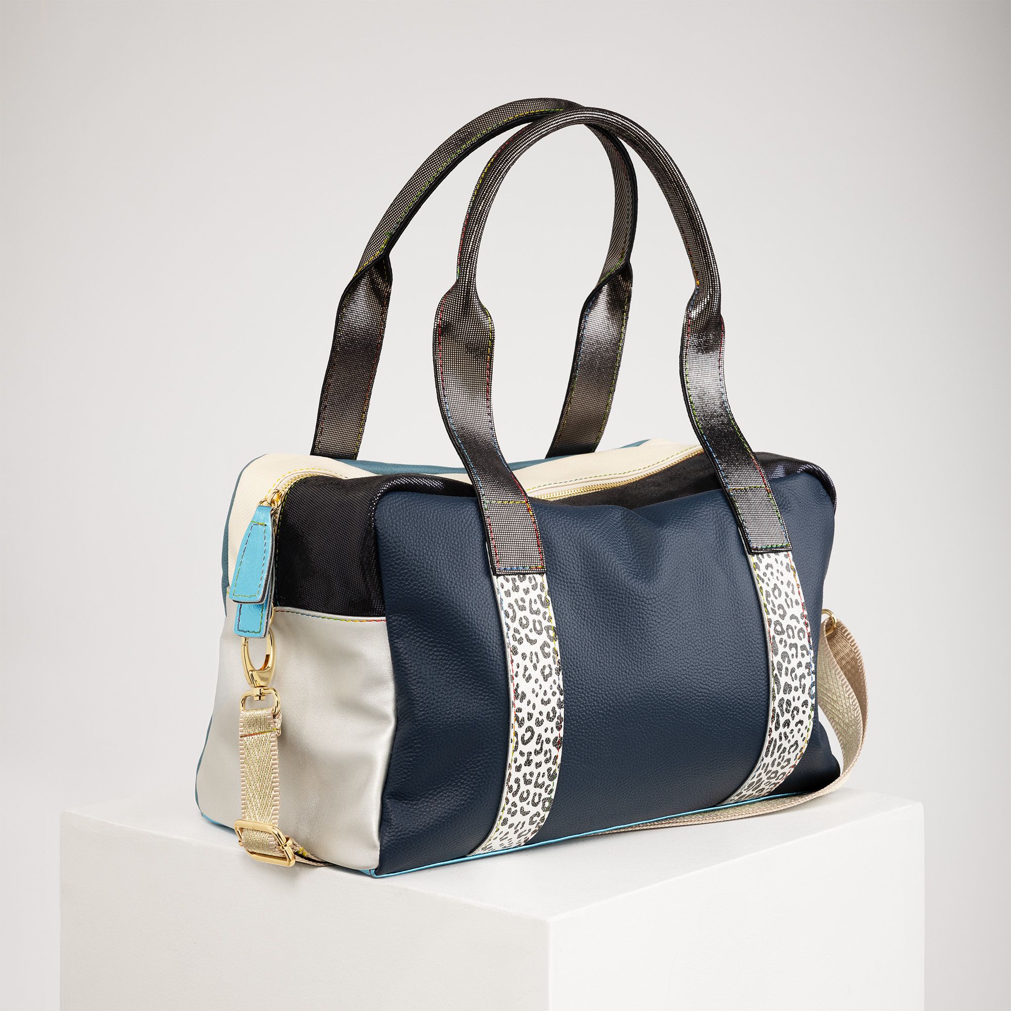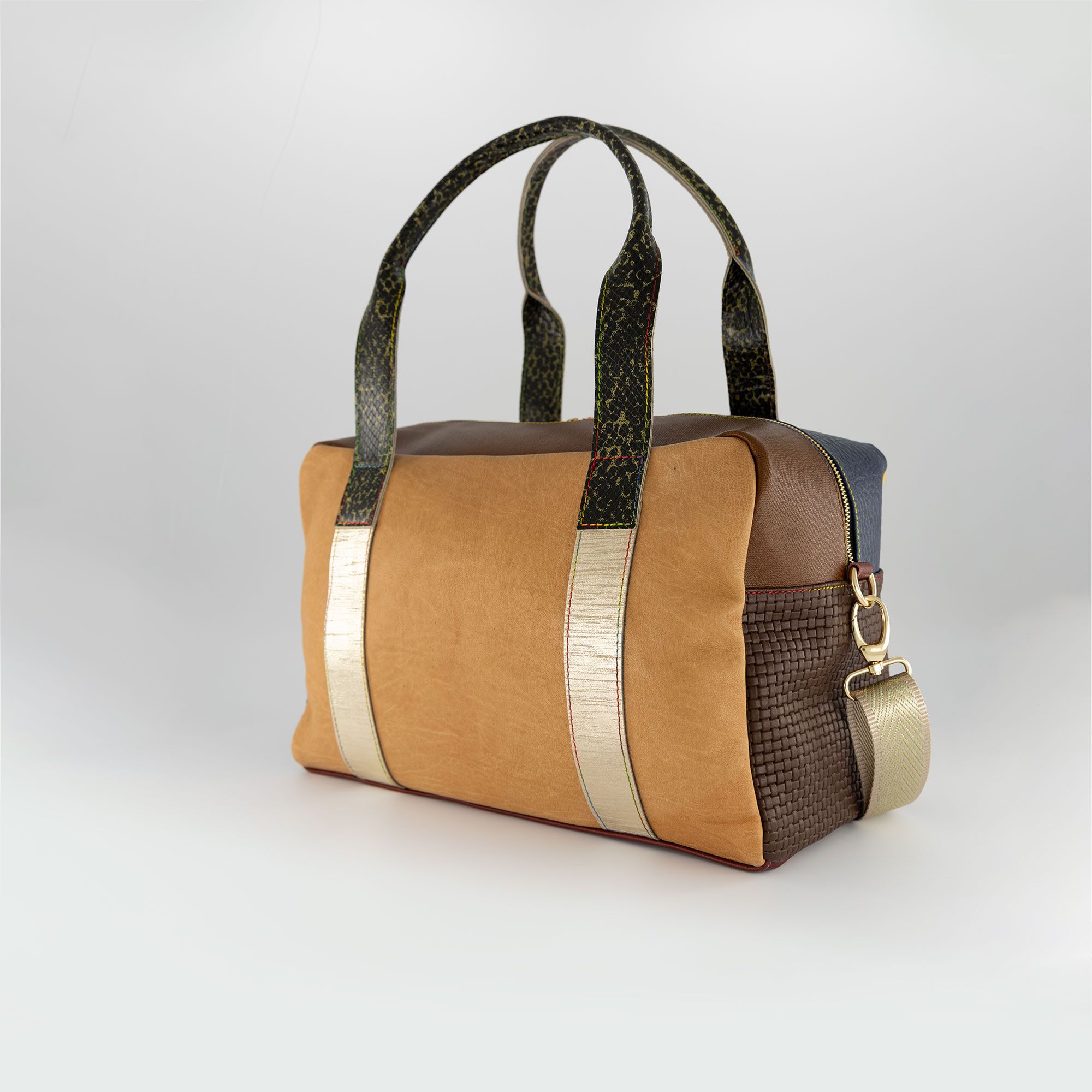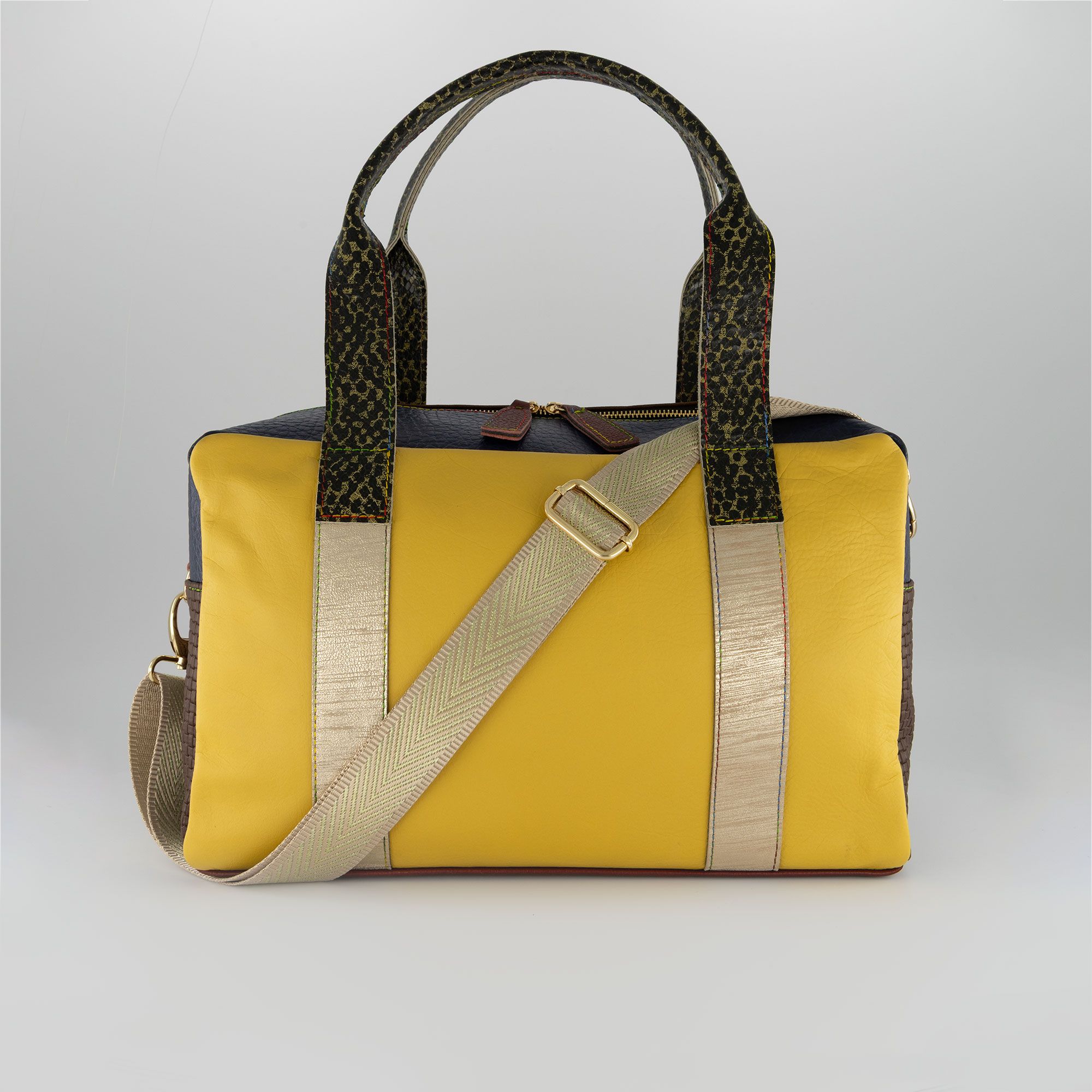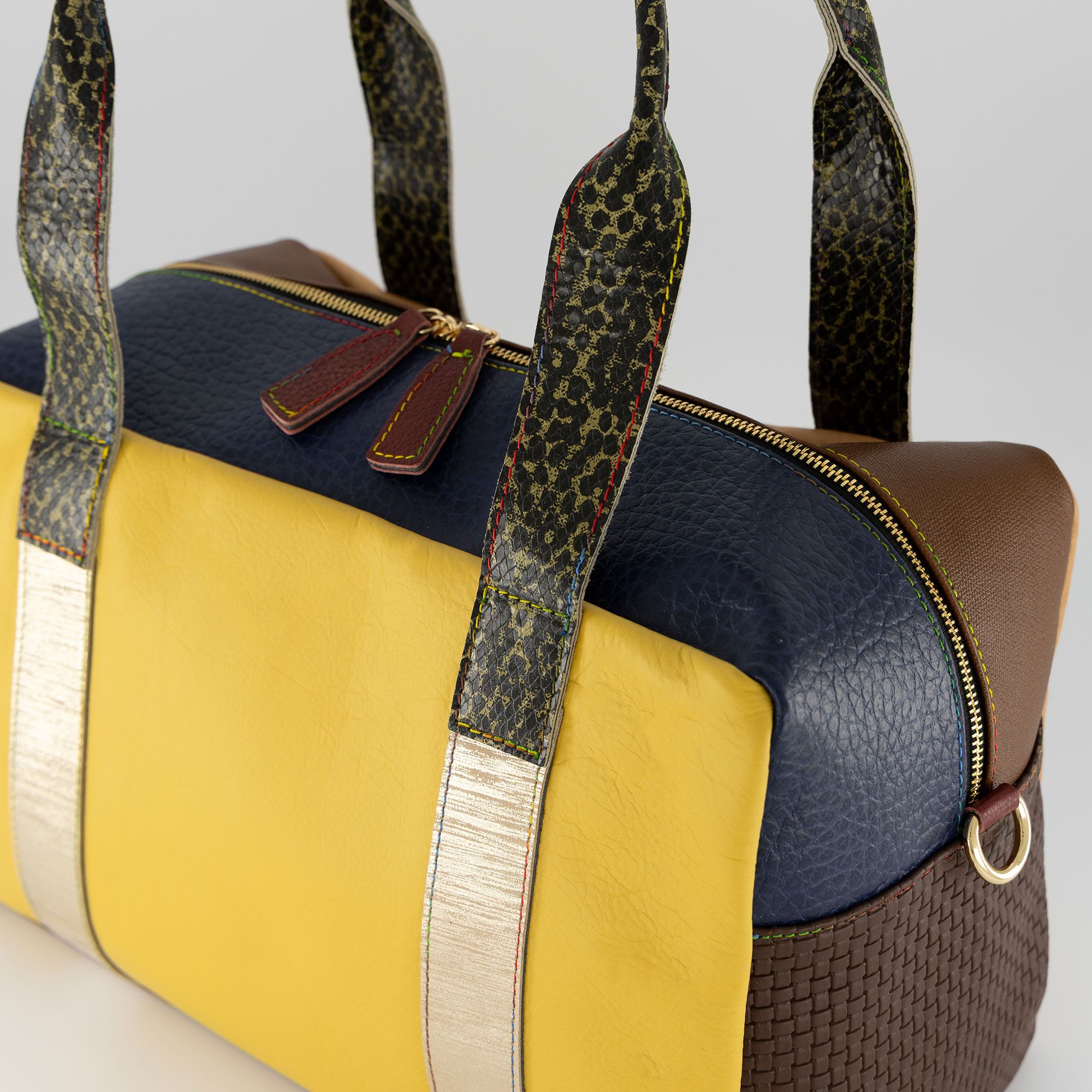 La pelle patchwork e i dettagli a contrasto regalano personalità e stile, perfetta per dare un tocco originale e vivace a ogni tuo look.