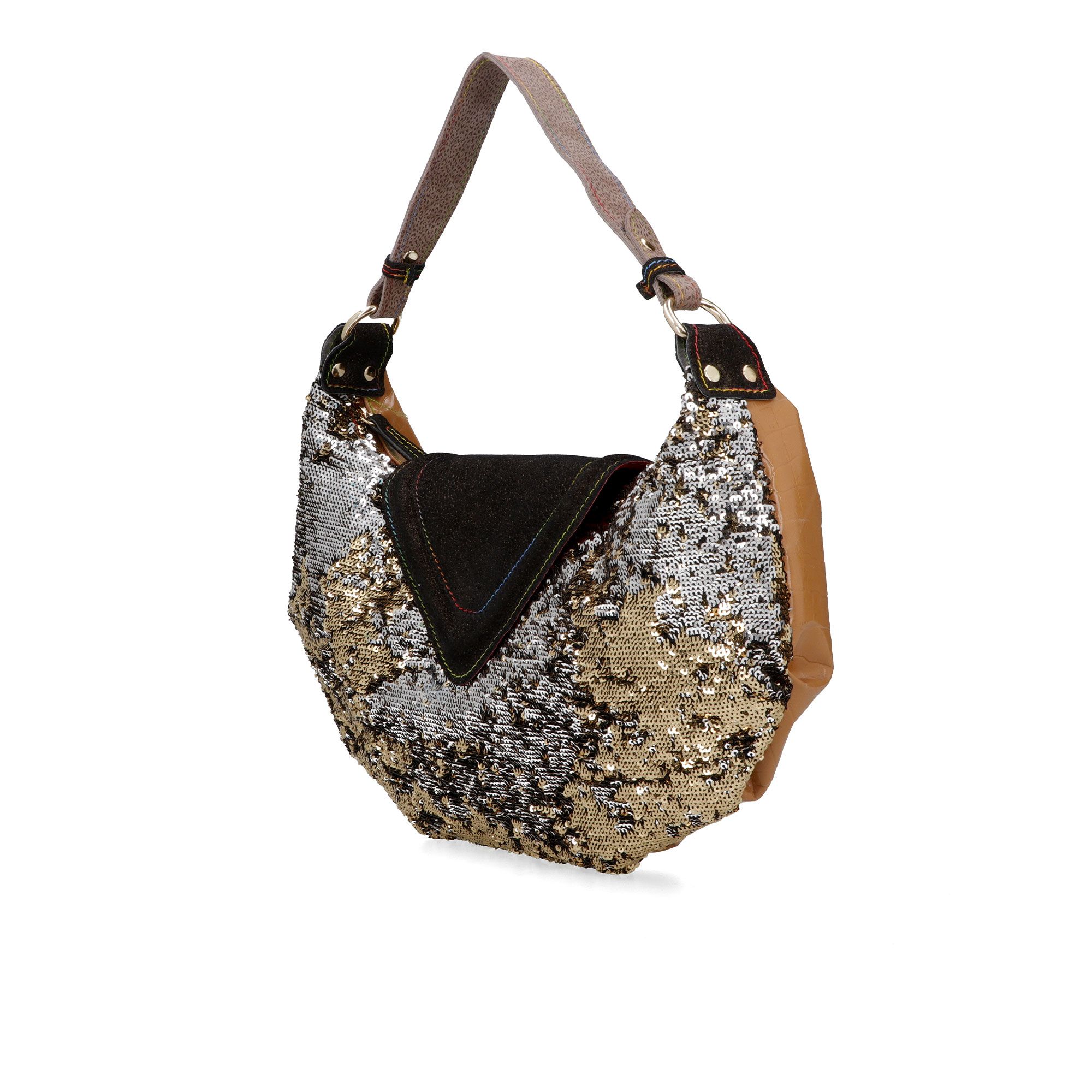 Perfetta per aggiungere un tocco di originalità ai tuoi outfit grazie al design patchwork e ai dettagli in paillettes, ideale per distinguerti con stile in ogni occasione.