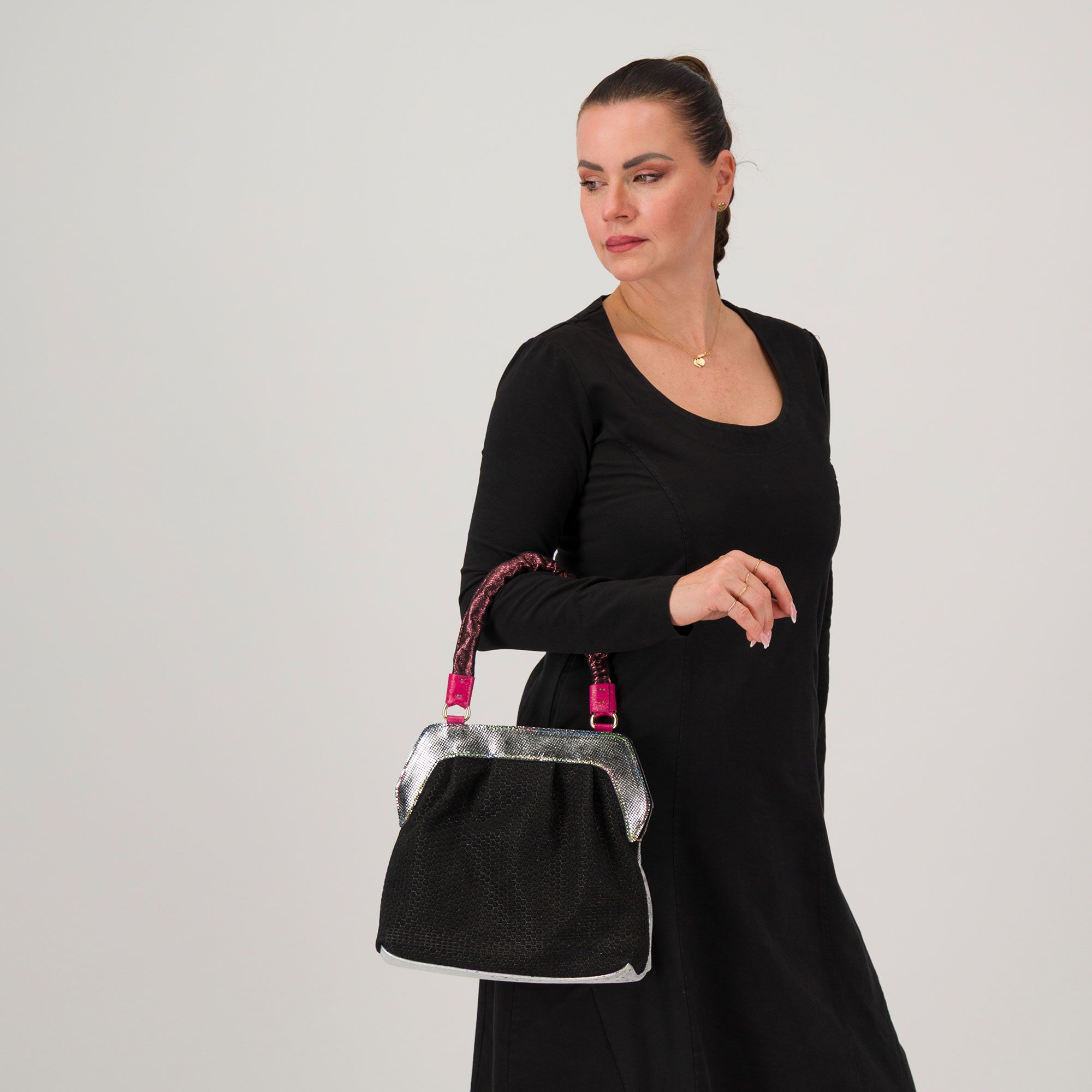 La combinazione di colori e materiali rende questa borsa un accessorio unico, perfetto per dare carattere e stile ai tuoi outfit quotidiani.