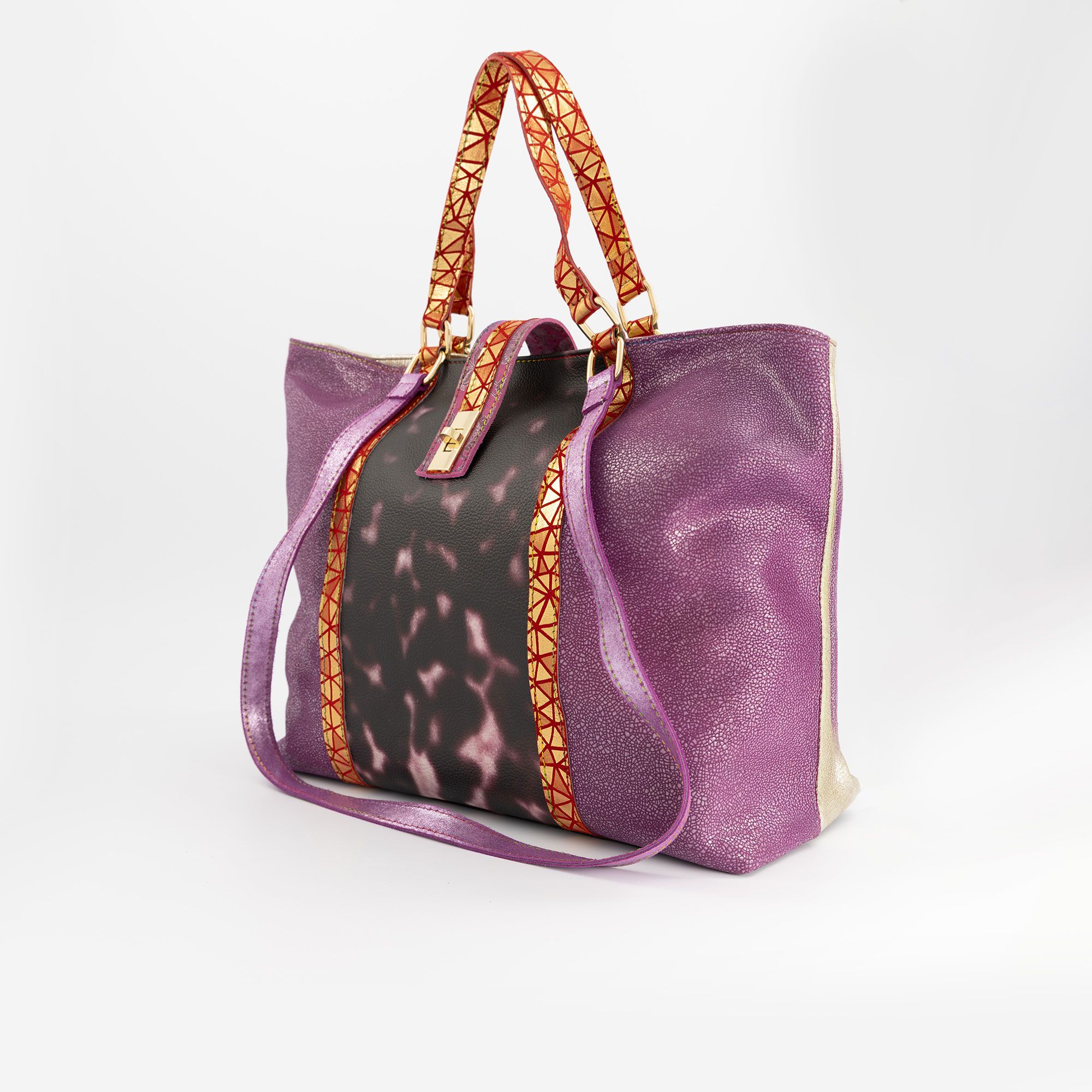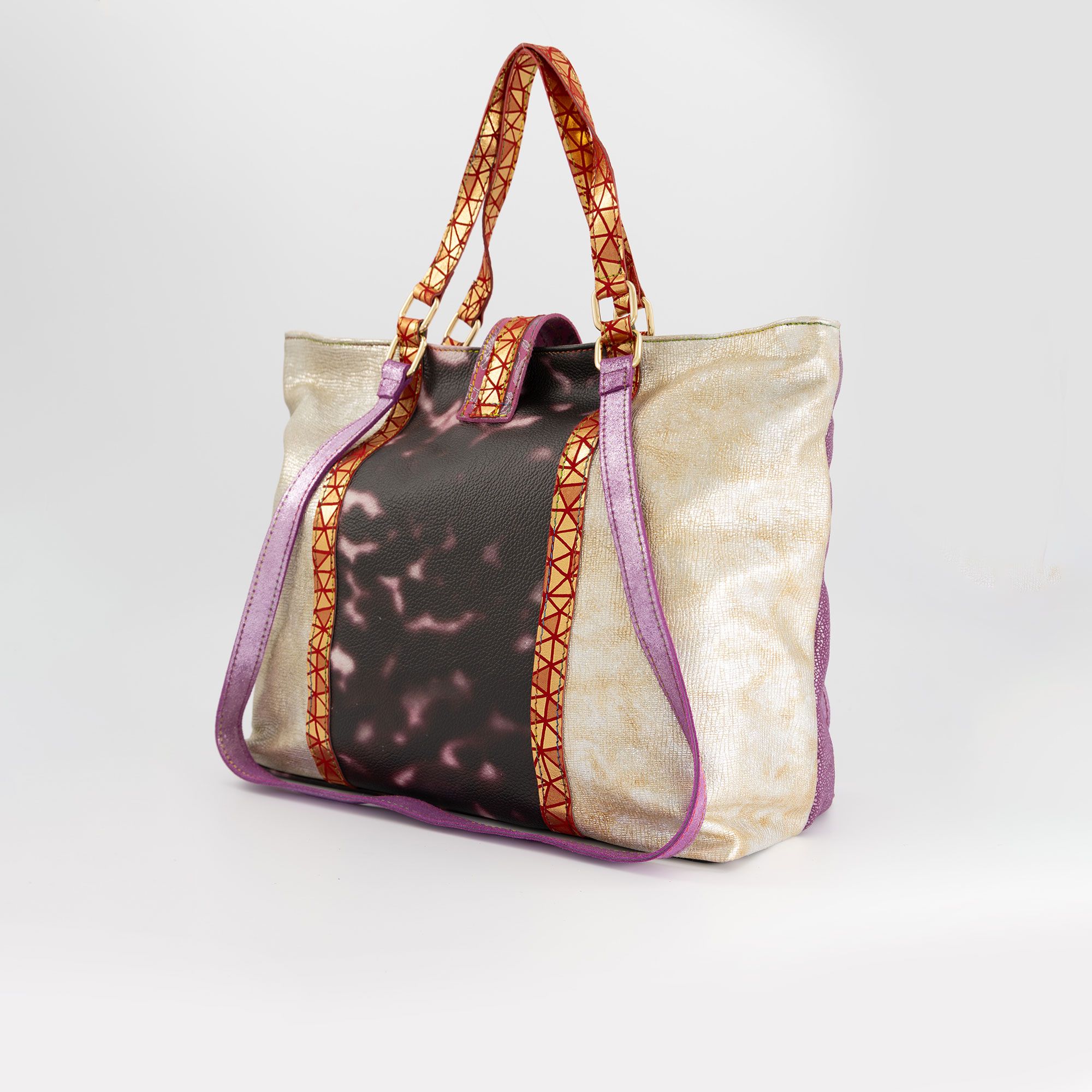 Il design patchwork in pelle e i manici doppi offrono versatilità e stile, rendendola perfetta per dare un tocco unico ai tuoi outfit quotidiani.