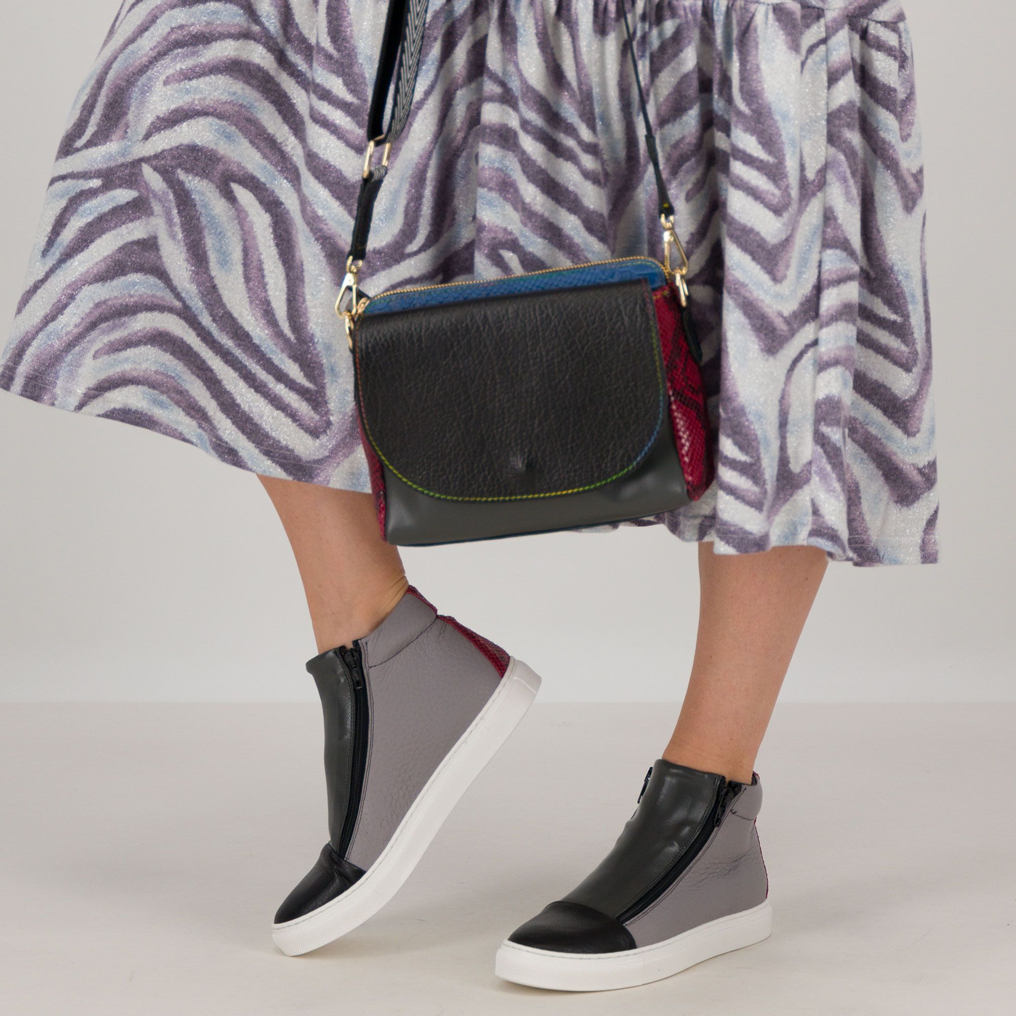 • la combinazione di pelle e tessuto la rende versatile e adatta ad ogni occasione