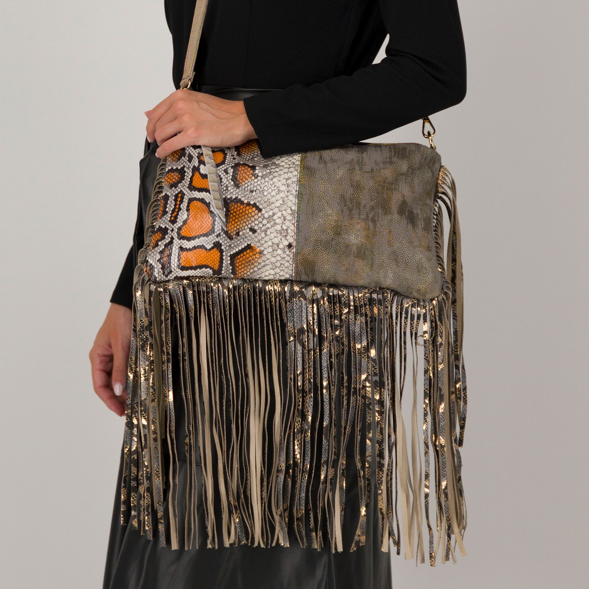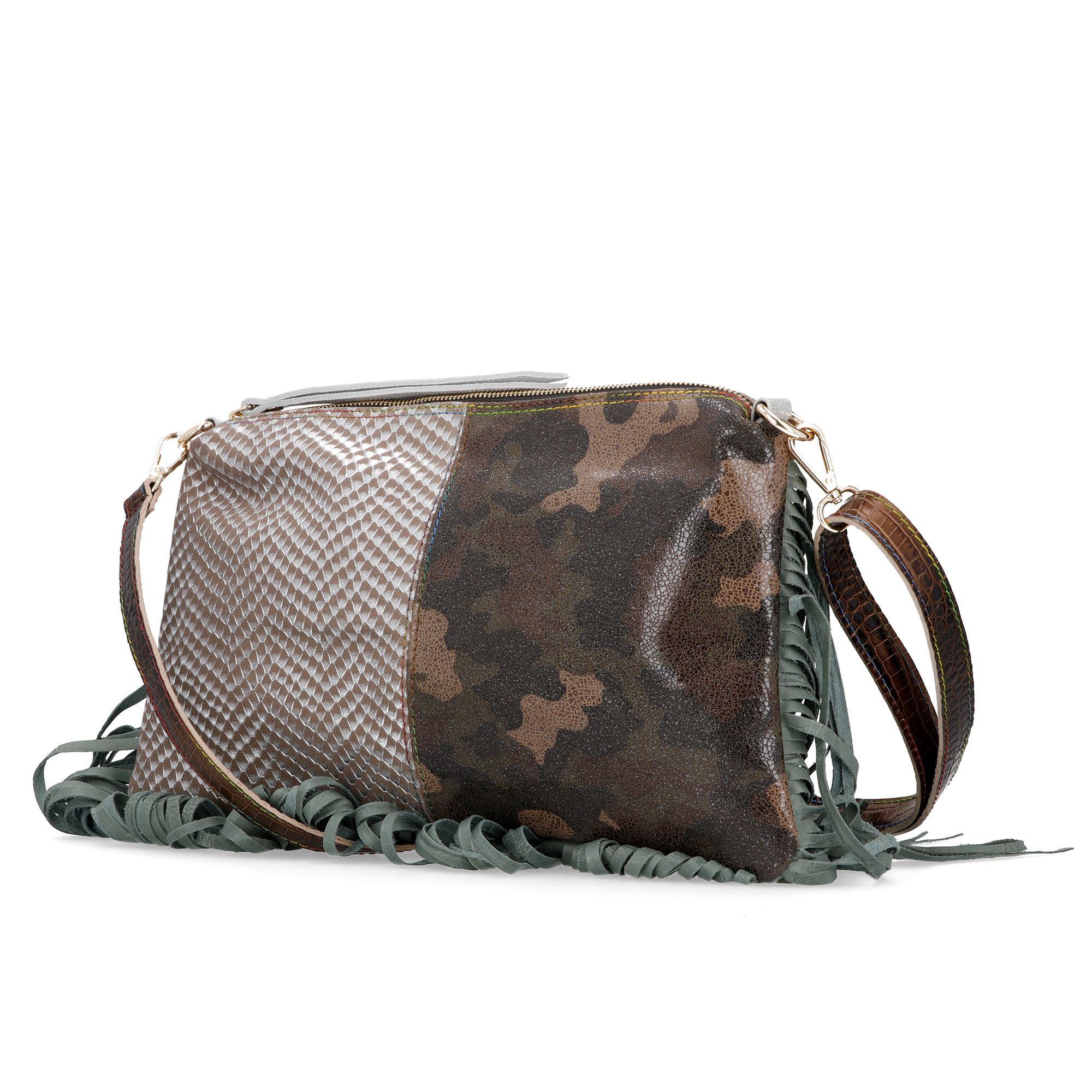 Un design patchwork con frange che dona carattere e originalità, perfetto per completare look casual o boho chic con un tocco unico.