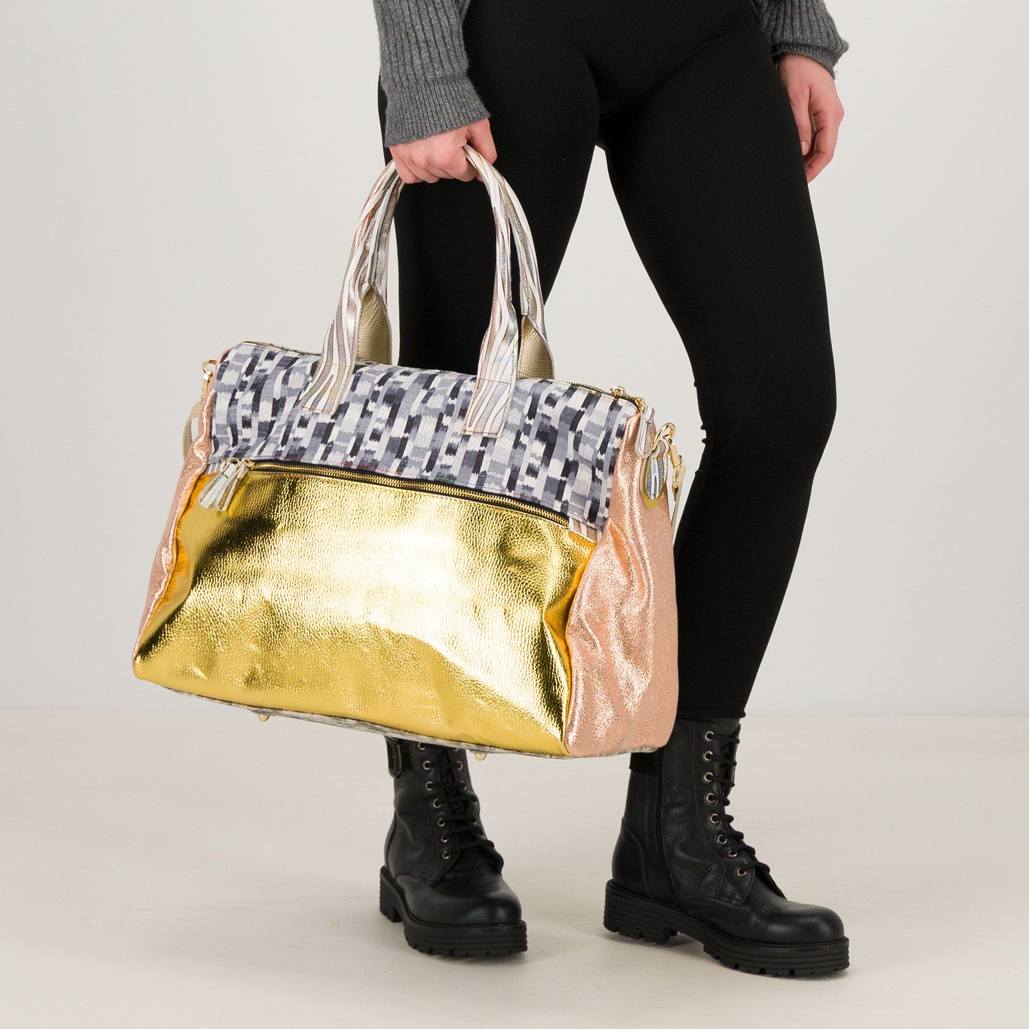 Perfetta per unire stile e funzionalità, questa maxi shopper in pelle patchwork è ideale per completare look casual o eleganti con un tocco originale e capiente.