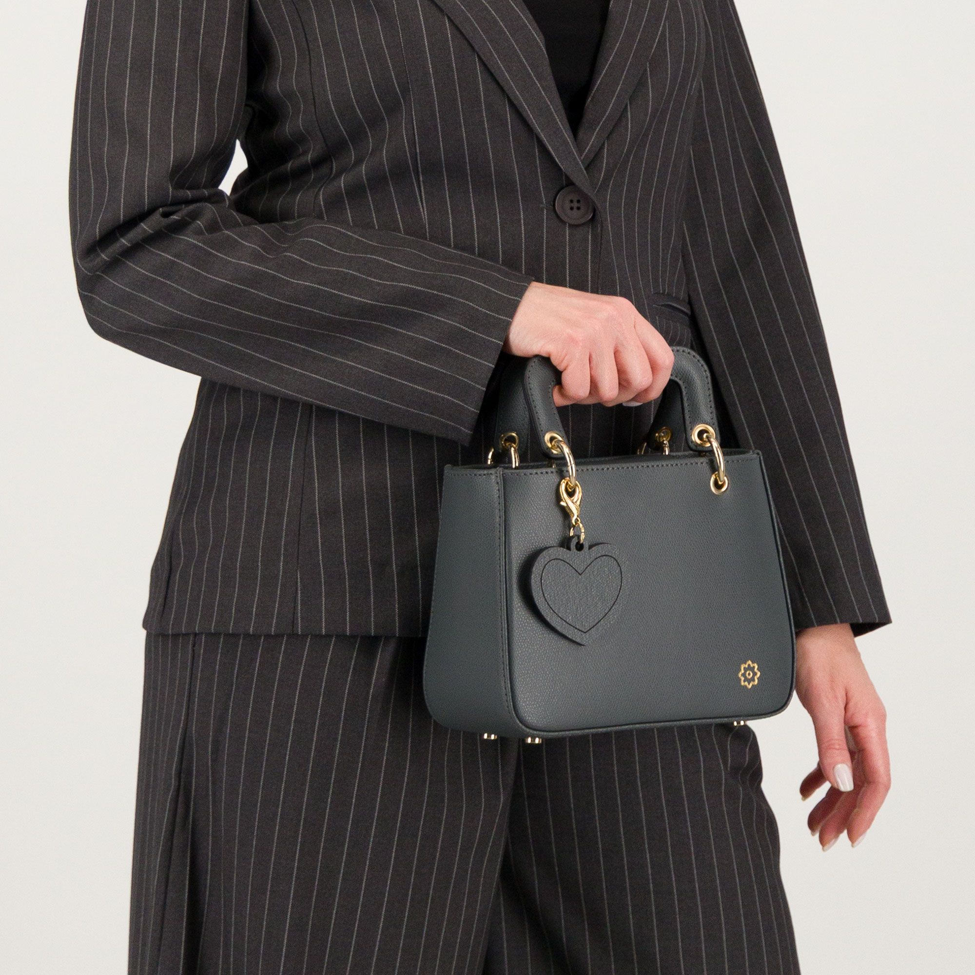 • charm cuore in pelle su pannello frontale, removibile tramite moschettone
