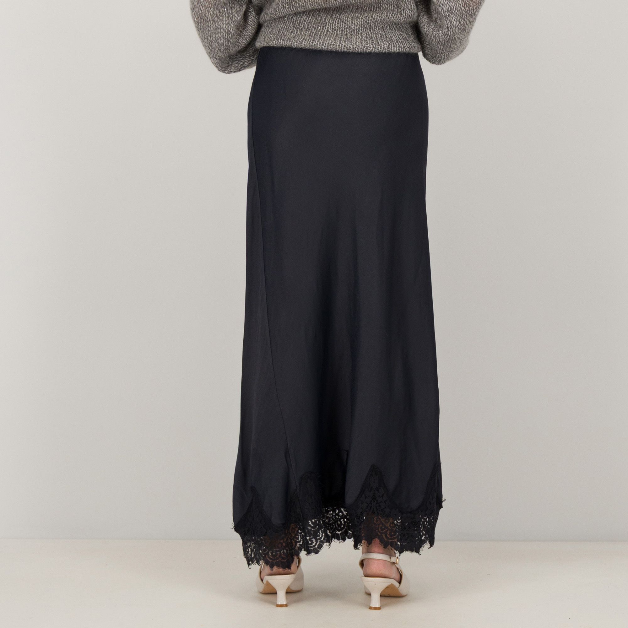 • gonna in raso tagliata in sbieco con inserto in pizzo al fondo