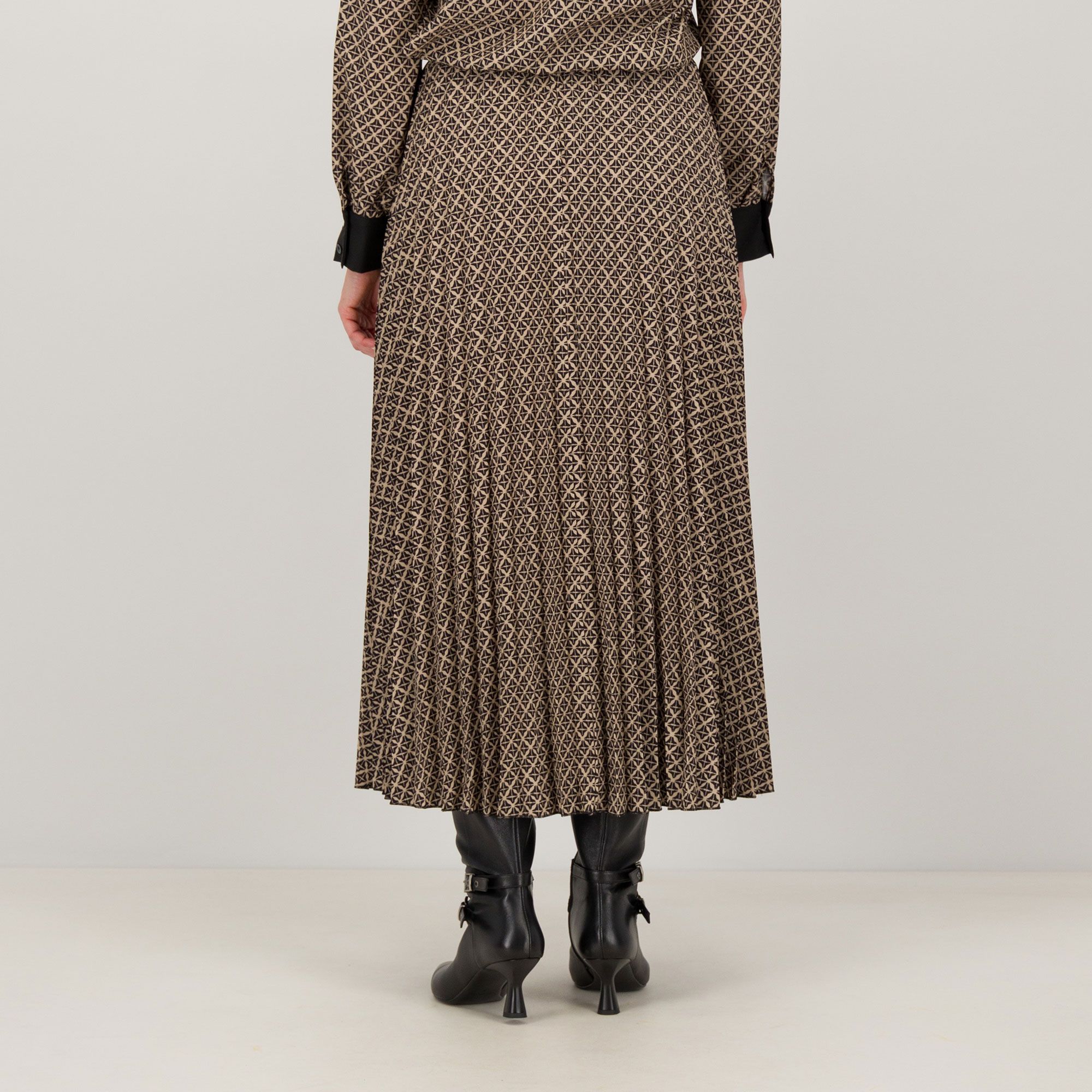 • la lavorazione plissettata e la fantasia geometrica donano movimento e personalità al look