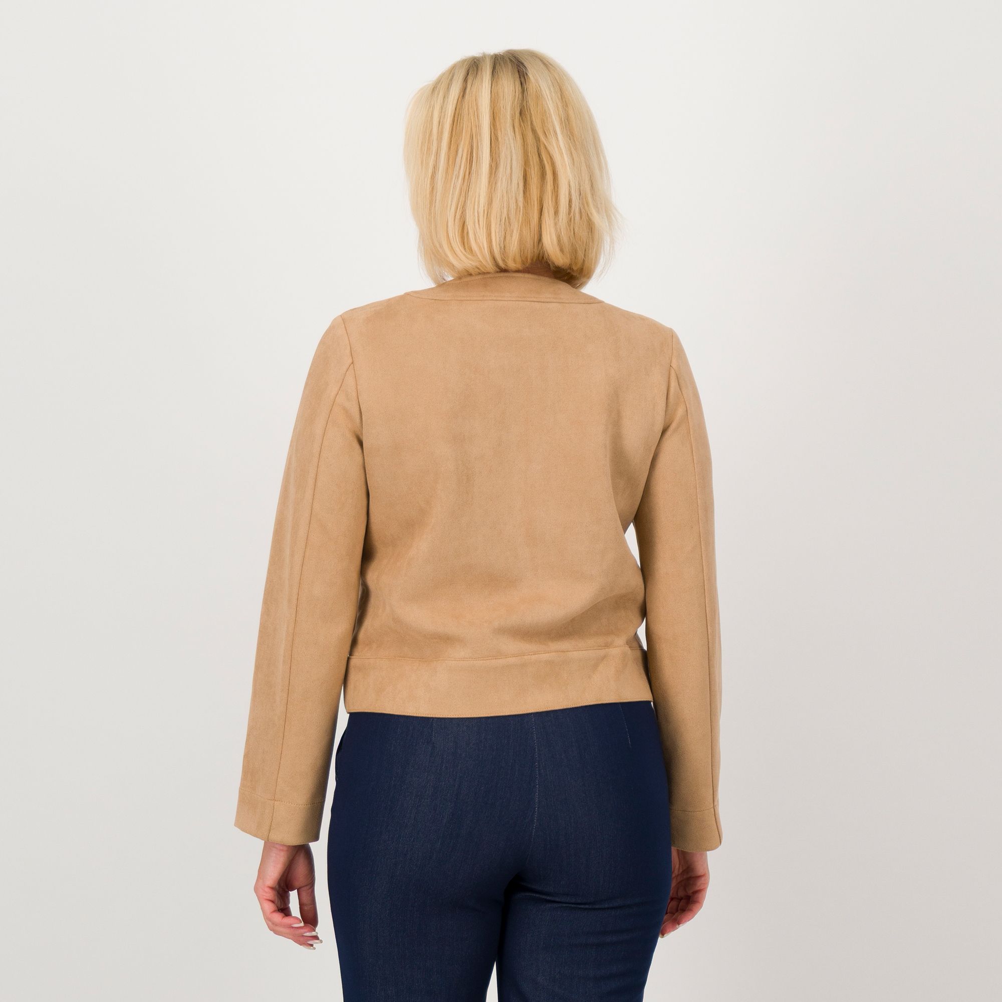 • giubbino in suede con scollo tondo e tasche