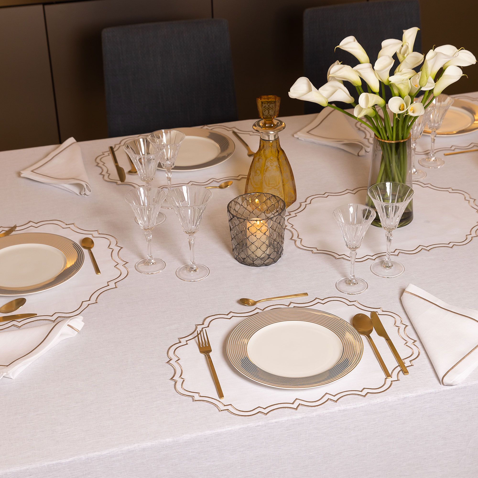 • il doppio ricamo intagliato valorizza il lino naturale con eleganza discreta e senza tempo