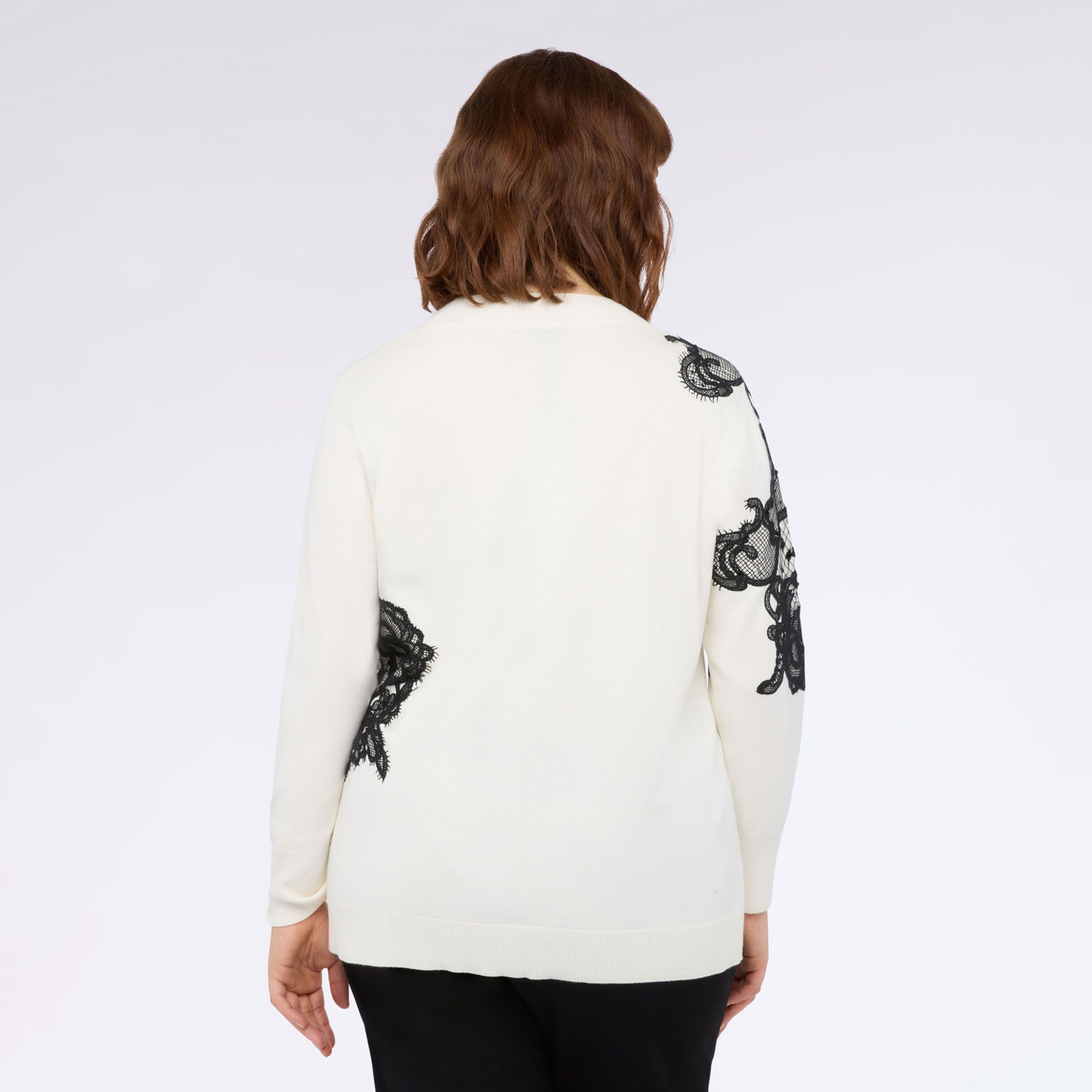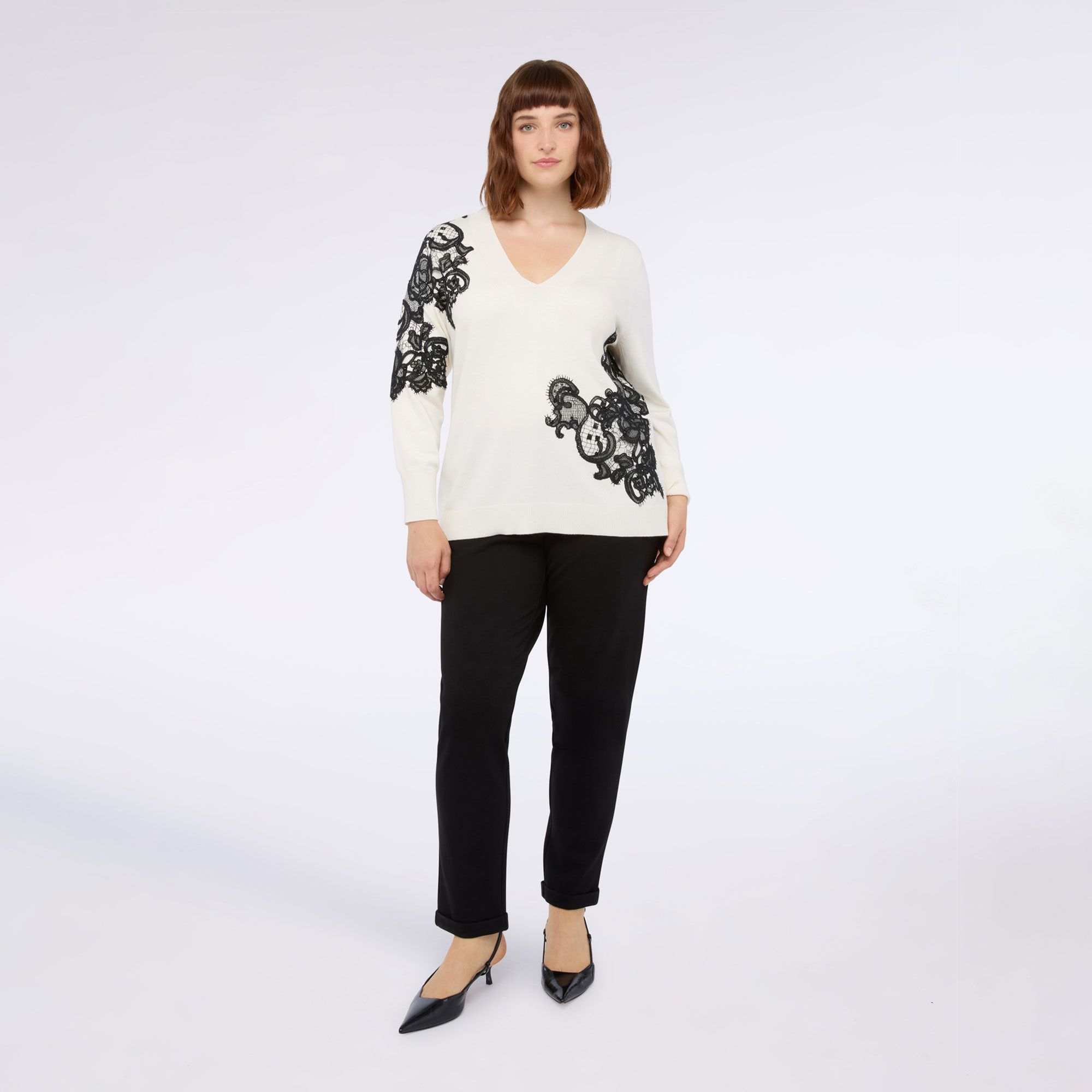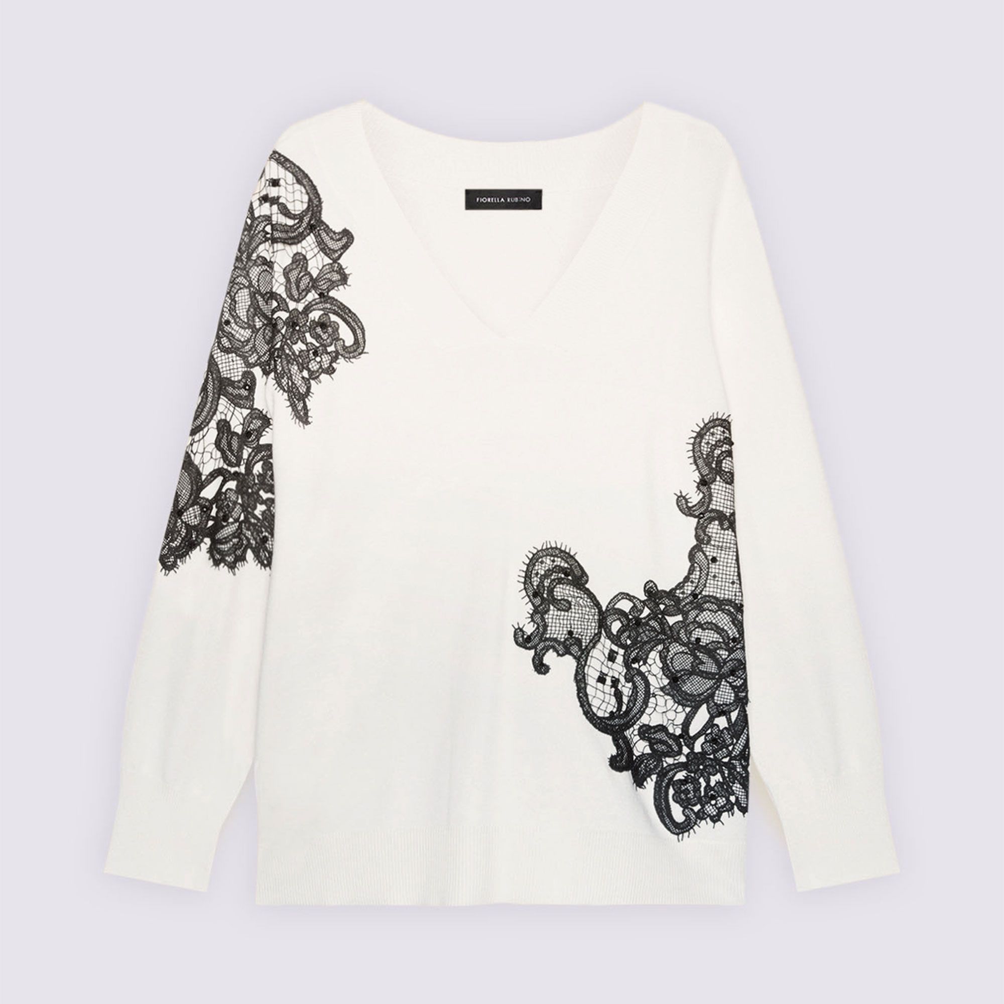 • decorazioni in pizzo nero applicate asimmetricamente su spalla e fianco