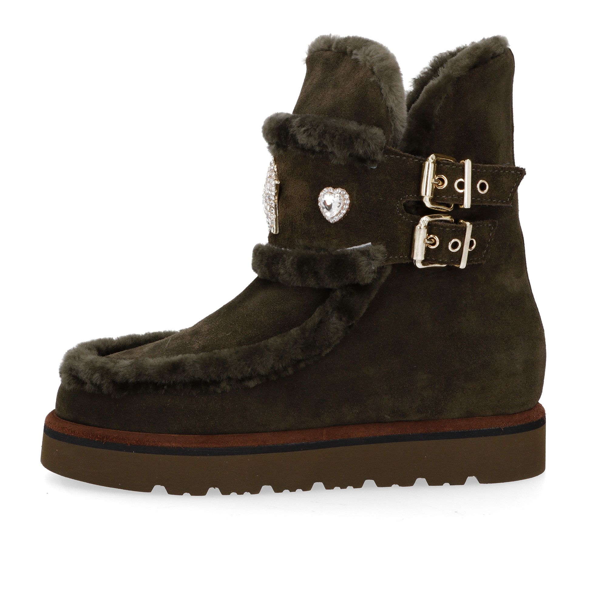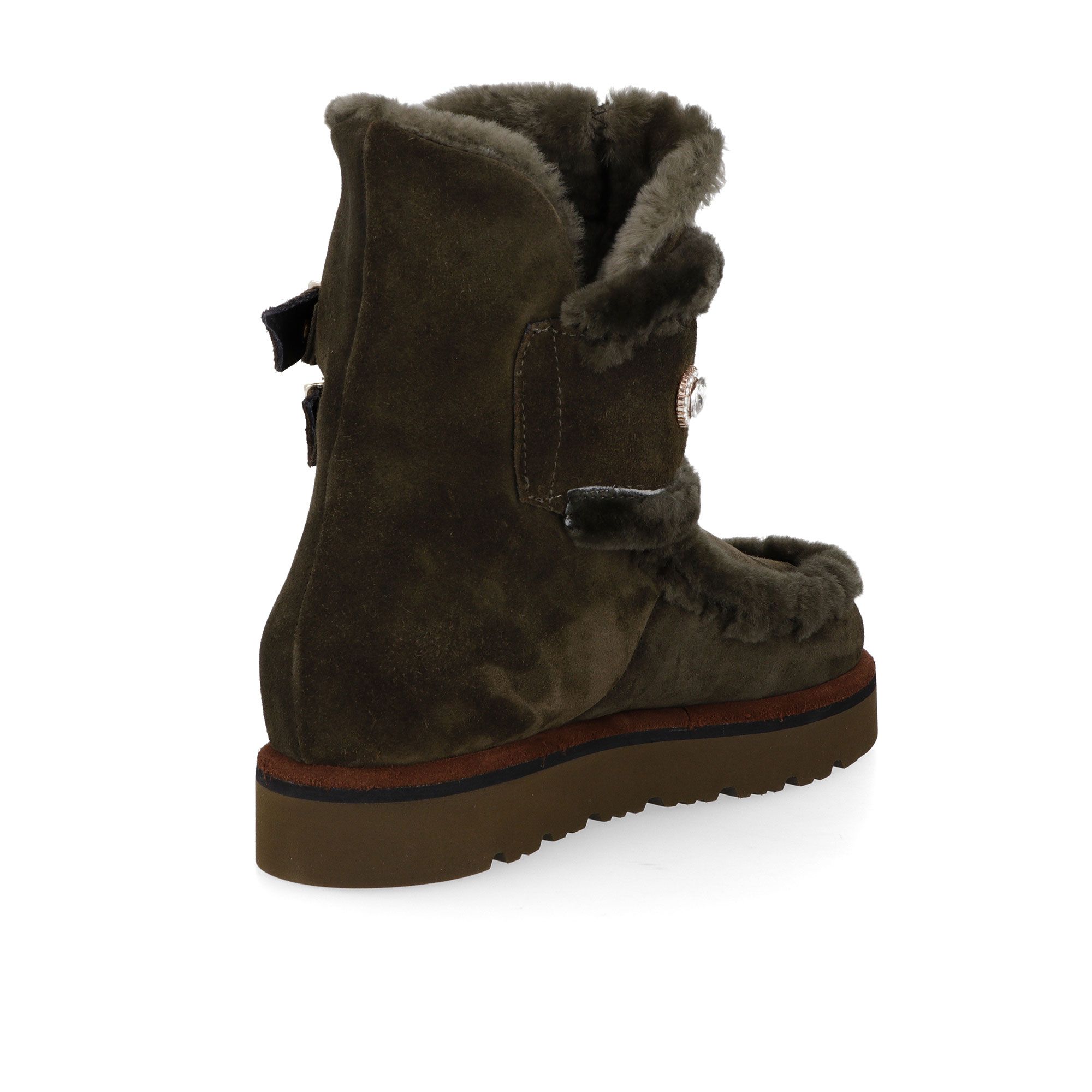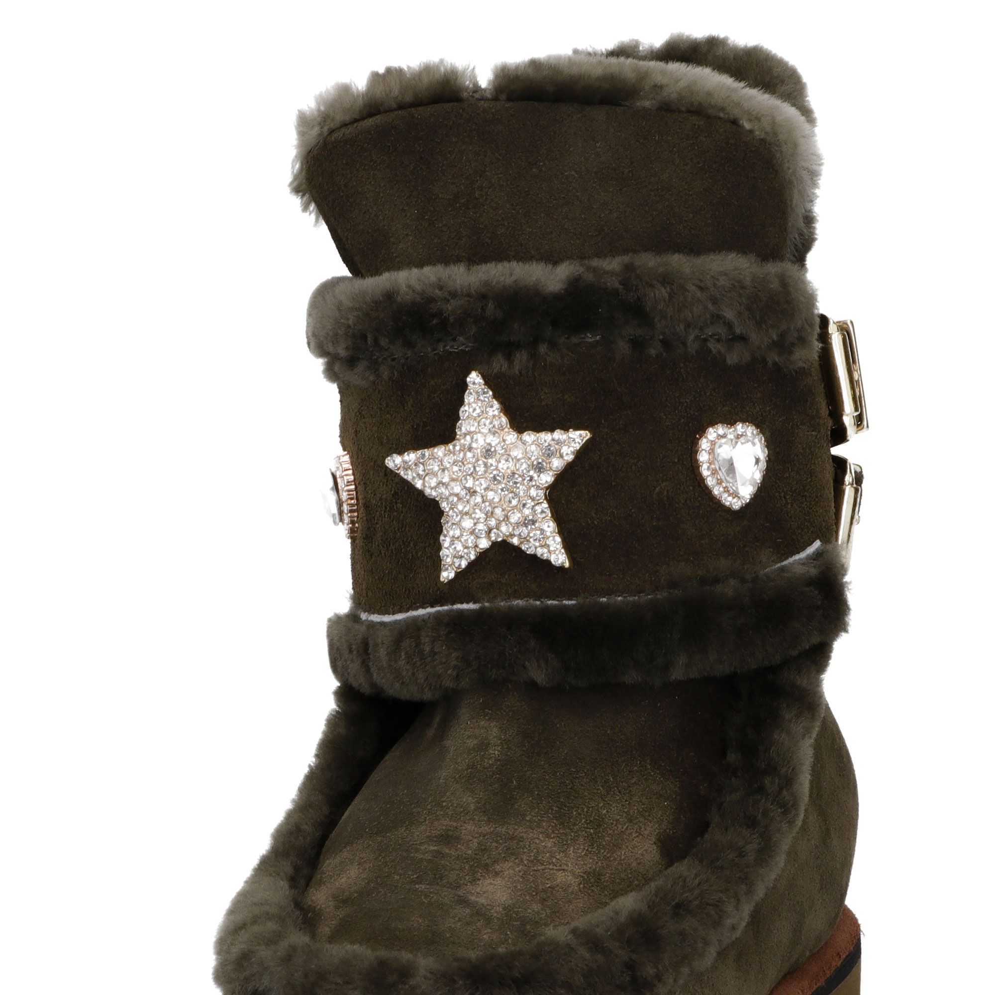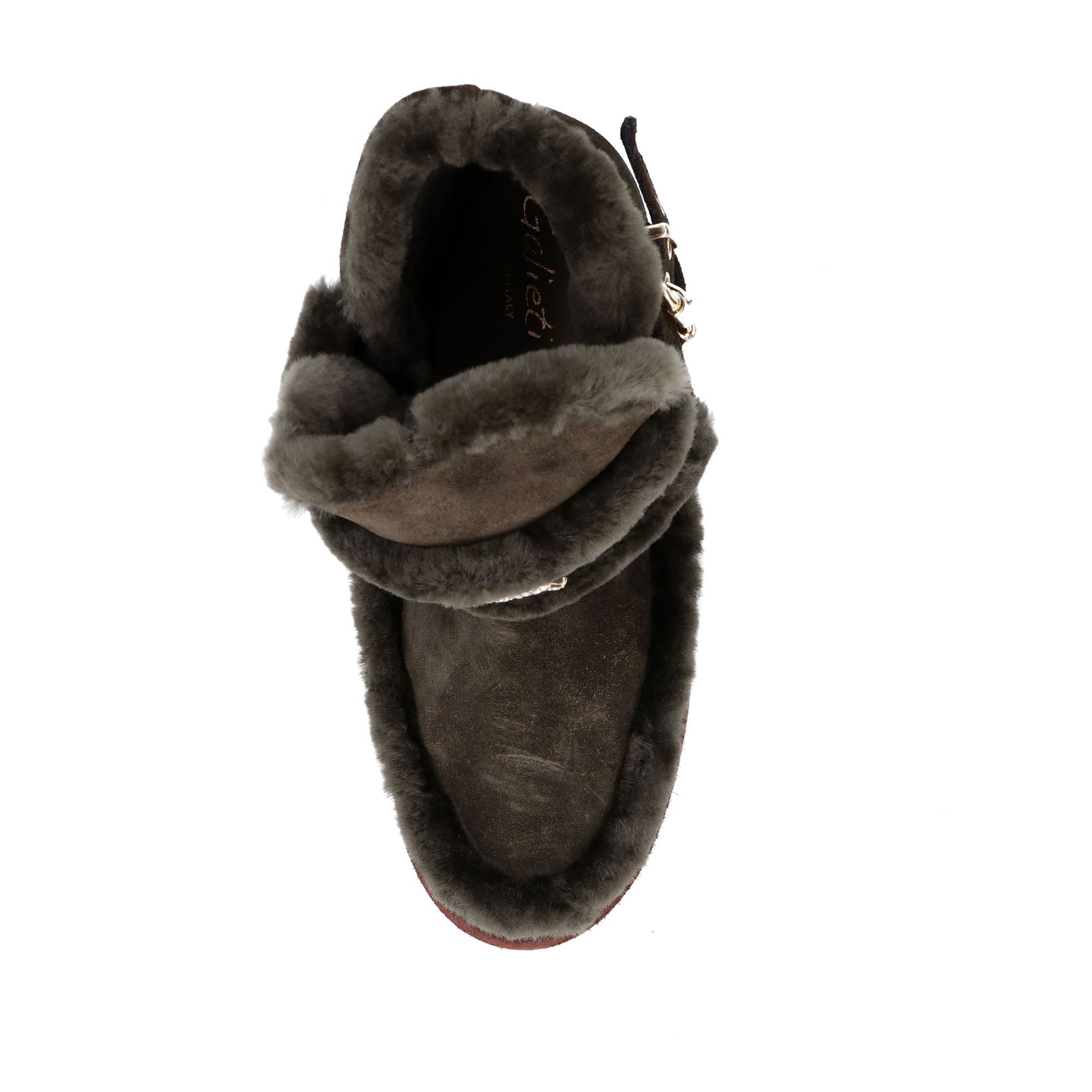 Questi stivaletti uniscono eleganza e comfort grazie alla pelle scamosciata e ai dettagli in montone, perfetti per completare look casual chic nelle giornate più fredde.