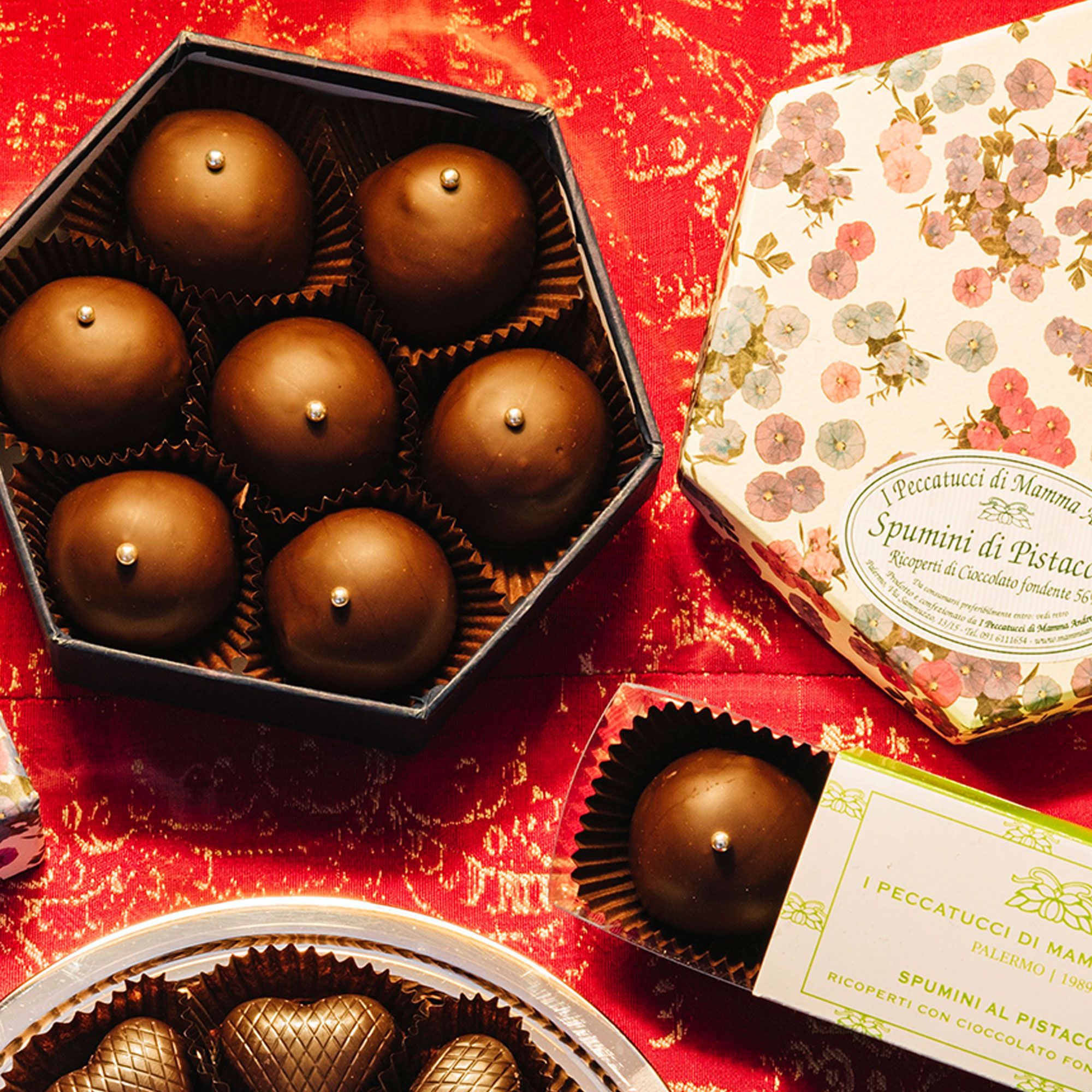 • una scatola con 7 praline di cioccolato fondente ripiene di pistacchio: il cuore di pistacchio è racchiuso da un sottile strato di cioccolato fondente al 56%, per un contrasto di gusto intenso e armonioso