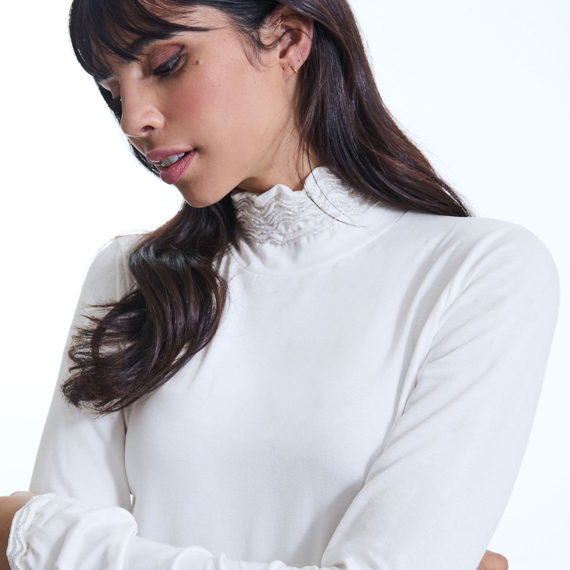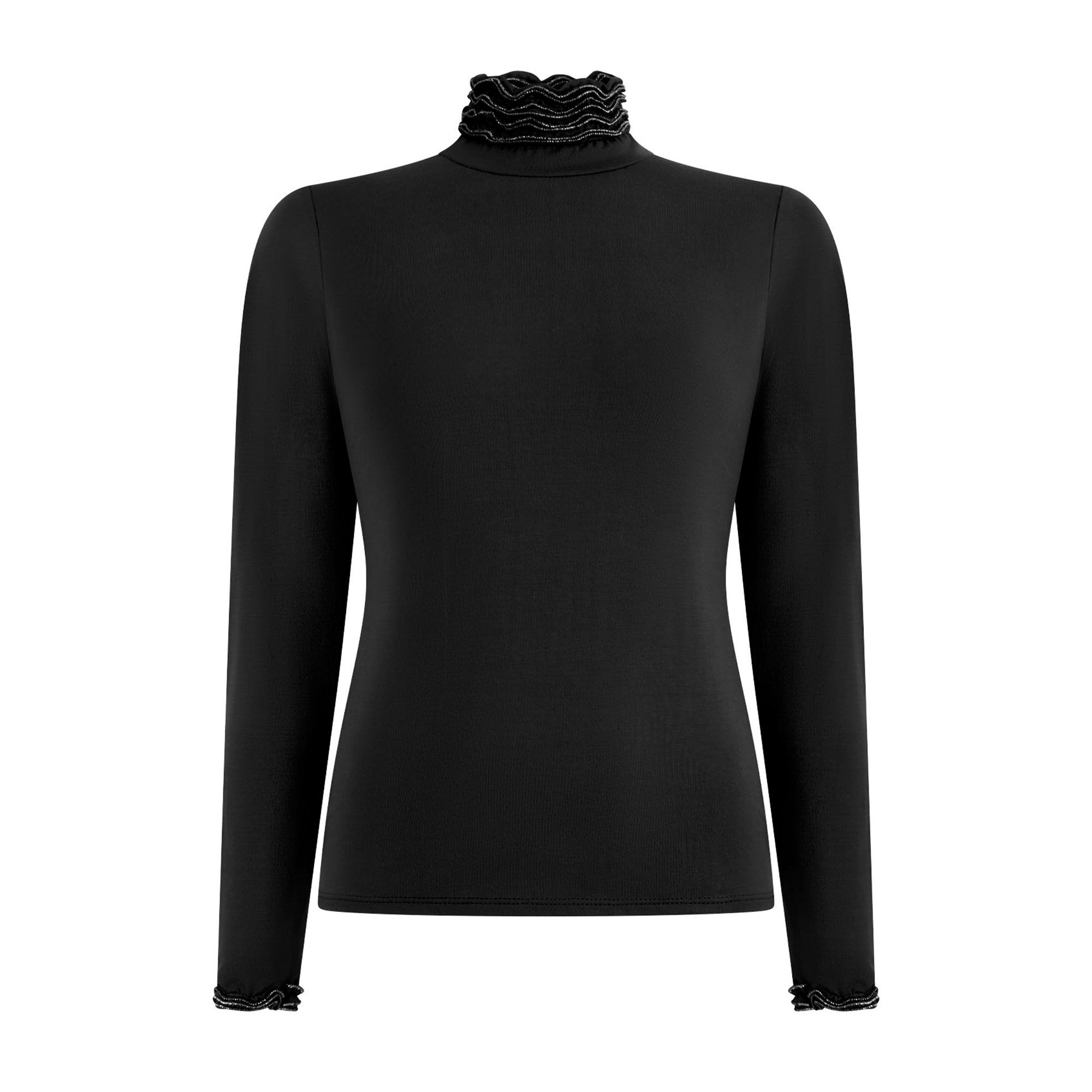 • il collo con rouches e profilo effetto metallico aggiunge un dettaglio raffinato e luminoso ai tuoi look
