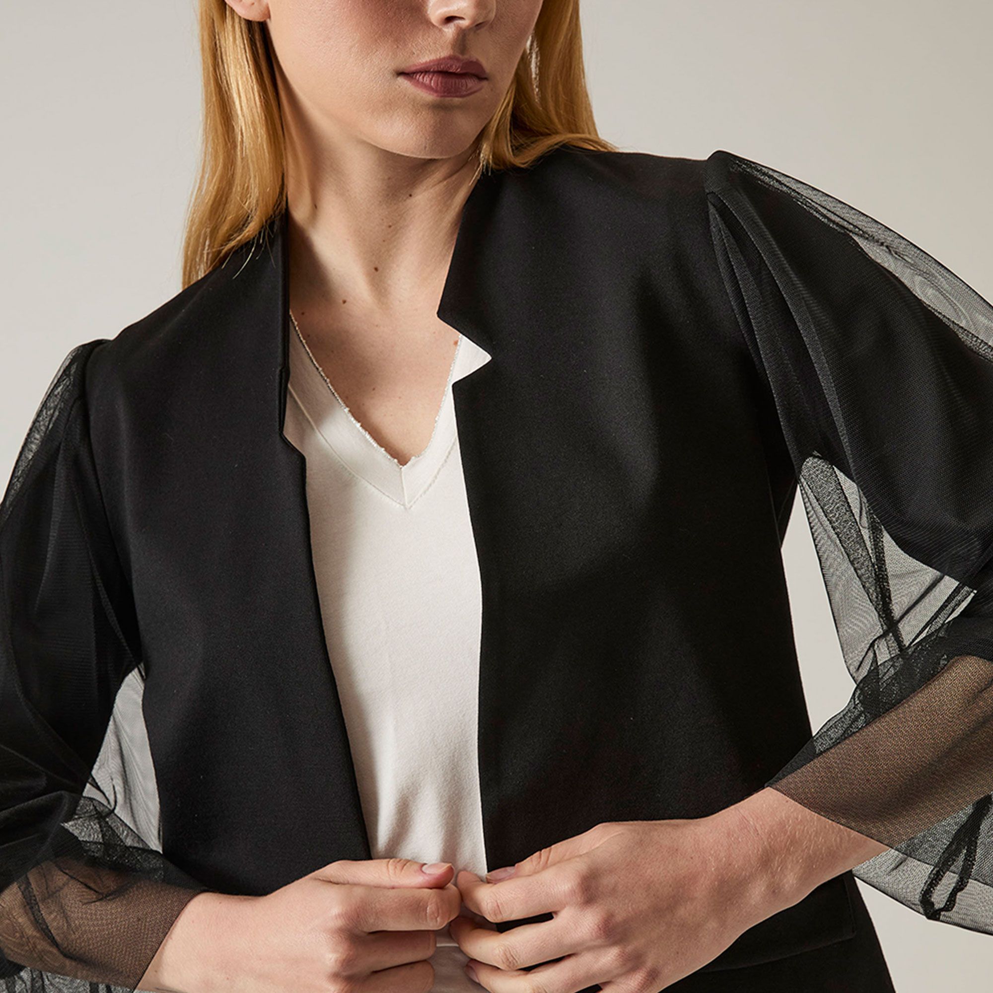 • maniche a sbuffo doppiate in tulle