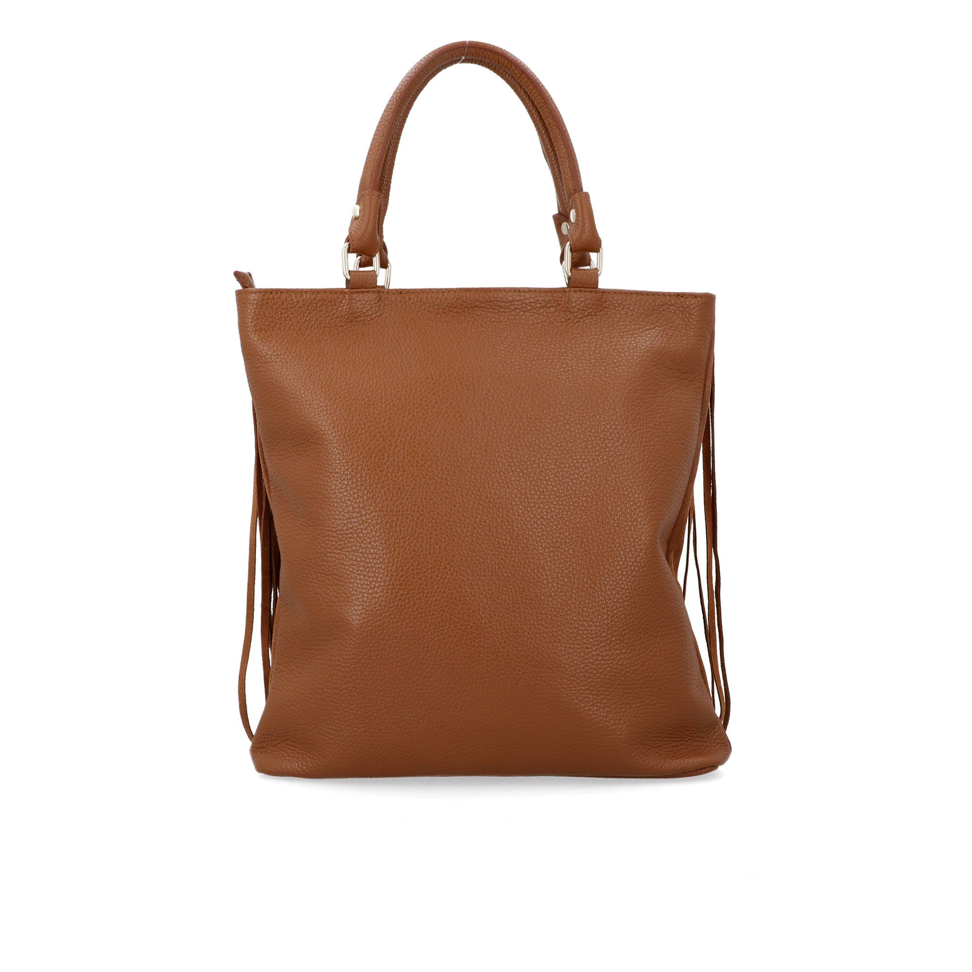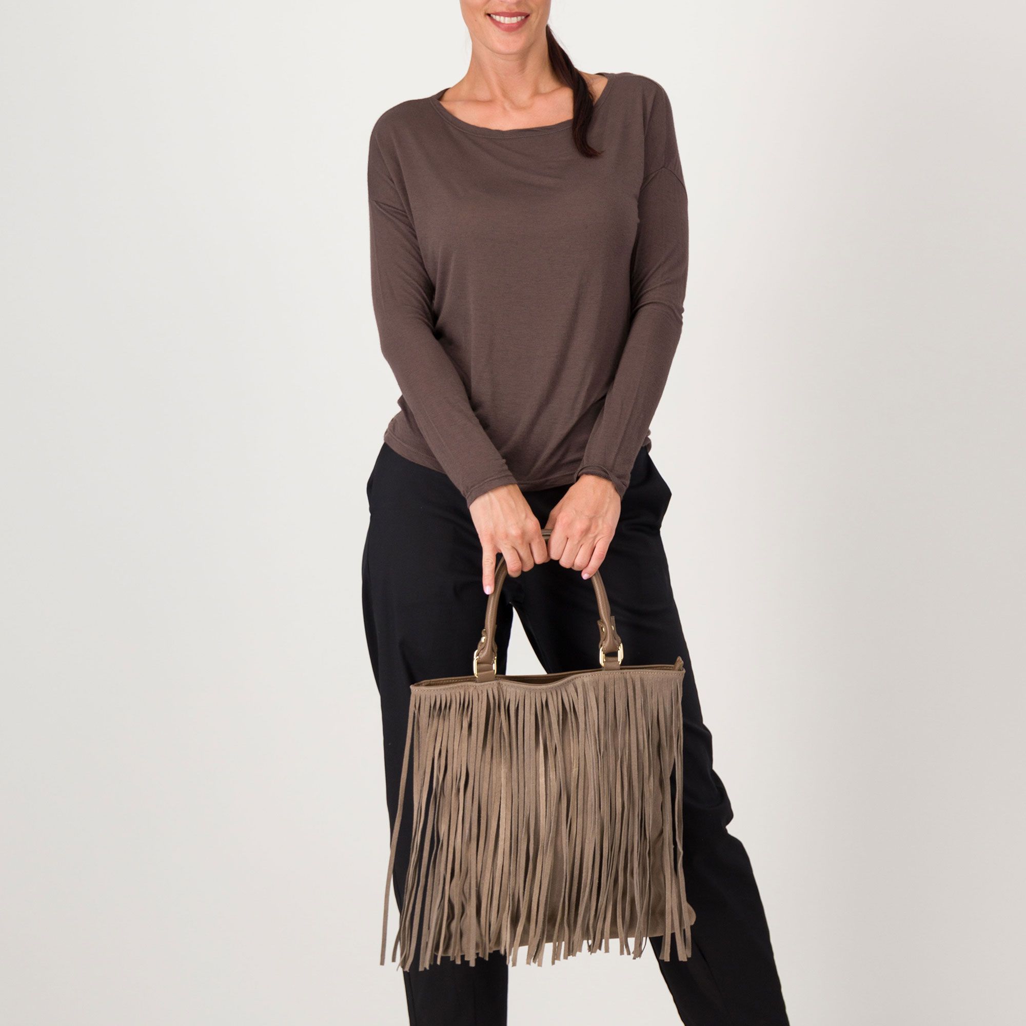 • borsa a mano in pelle con fronte scamosciato e frange