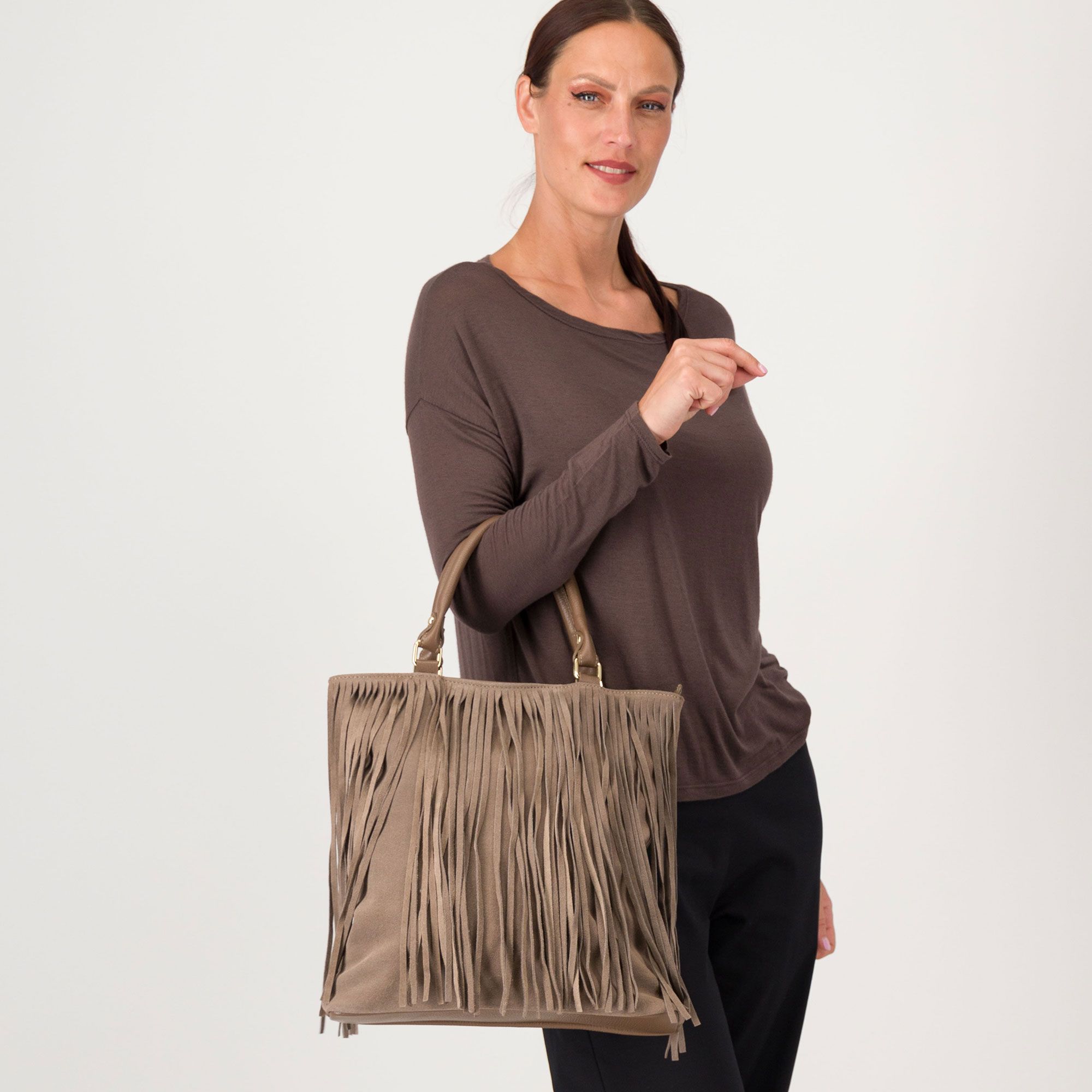 Le frange donano un tocco vivace e moderno, mentre la pelle scamosciata regala personalità ai tuoi look quotidiani. Perfetta da indossare ogni giorno per distinguerti con stile.
