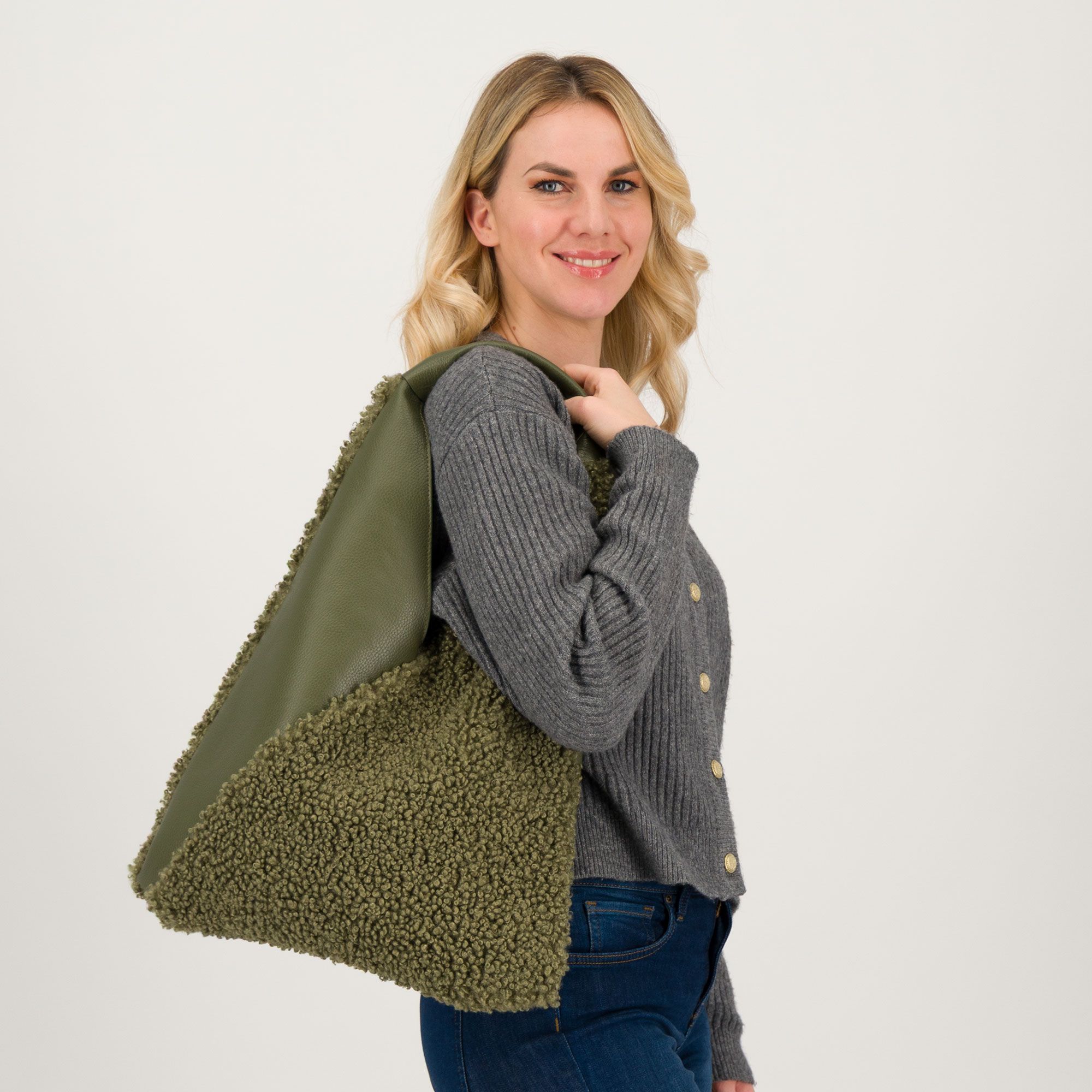 Perfetta per dare un tocco di stile e originalità ai tuoi look quotidiani, unendo la capienza di una shopper alla morbidezza degli inserti in peluche.