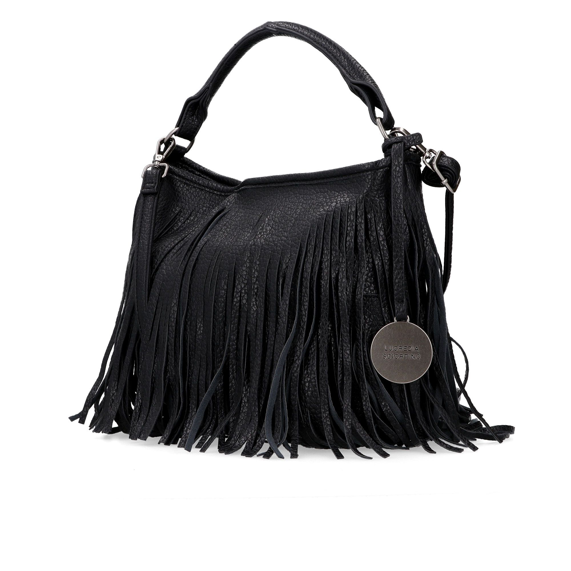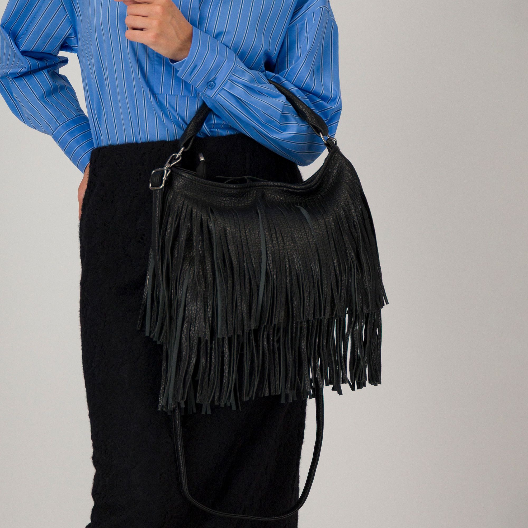 Il design con frange e dettagli logati dona un tocco originale e di tendenza, perfetto per completare look casual o boho chic con personalità.
