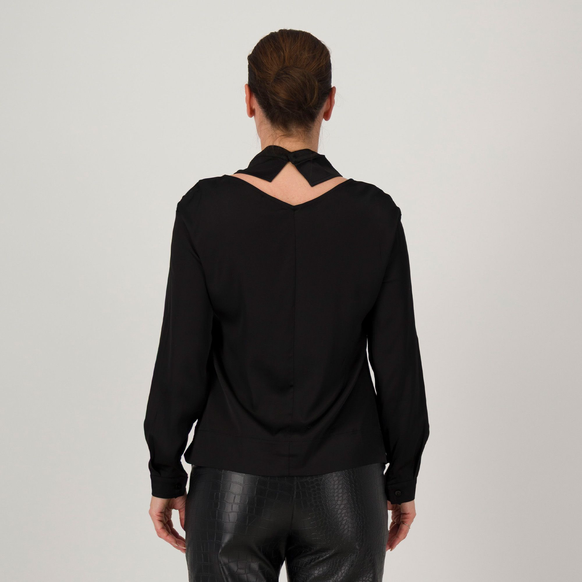 • scollo a V dietro con colletto a camicia applicato e chiusura con bottoncino posteriore