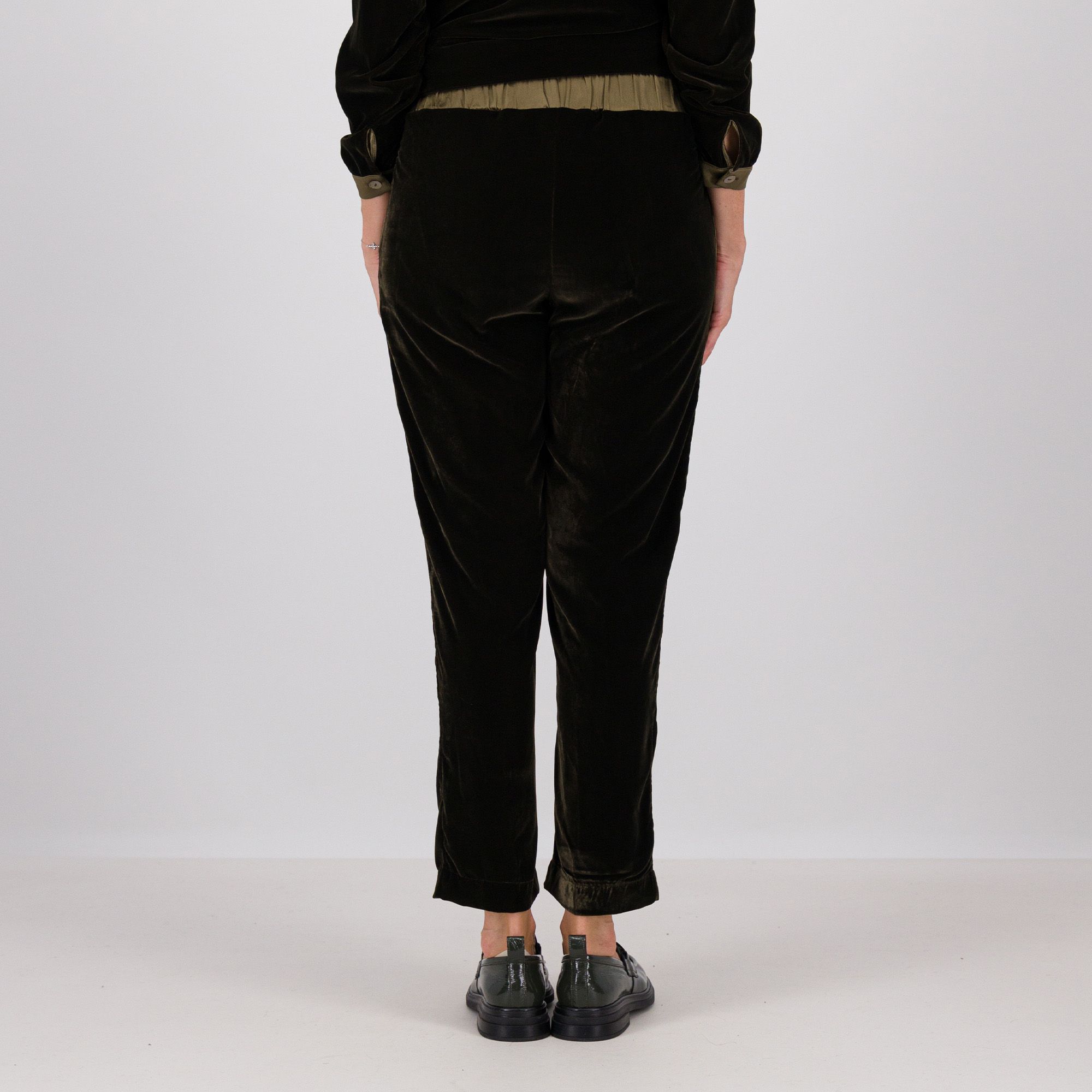 • pantaloni gamba dritta in velluto liscio effetto cangiante