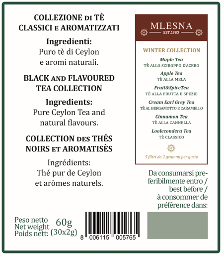 • astuccio tè Winter Collection Mlesna (30 filtri x 2 g): selezione di tè di Ceylon aromatizzati e speziati, tra cui Cream Earl Grey, Mela, Sciroppo d’Acero, Cannella, Tropical Fire e Loolecondera, sigillati singolarmente per preservare aroma e freschezza