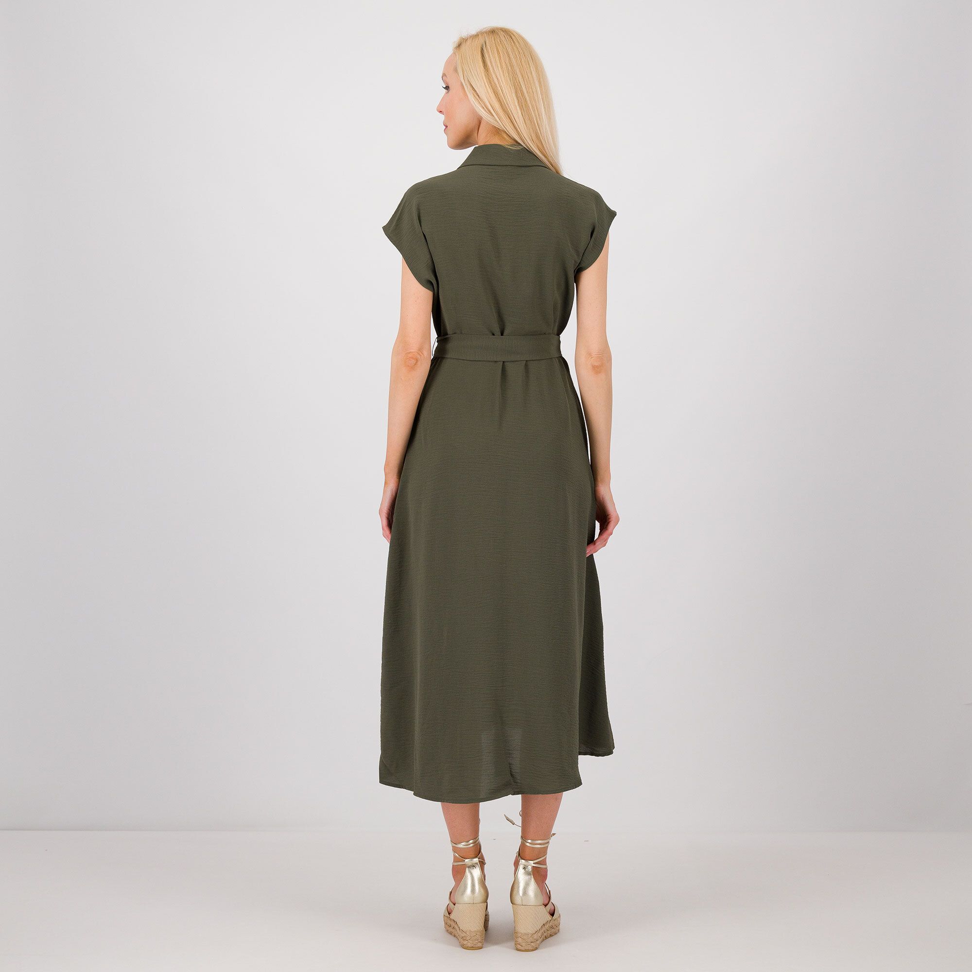Questo abito chemisier è l'ideale per chi cerca un capo versatile e di tendenza. Perfetto abbinato a un paio di décolleté per un look professionale, si trasforma facilmente in un outfit casual chic con sneakers bianche e una borsa a tracolla per il weekend. La cintura in vita valorizza la silhouette, rendendolo adatto a ogni occasione.