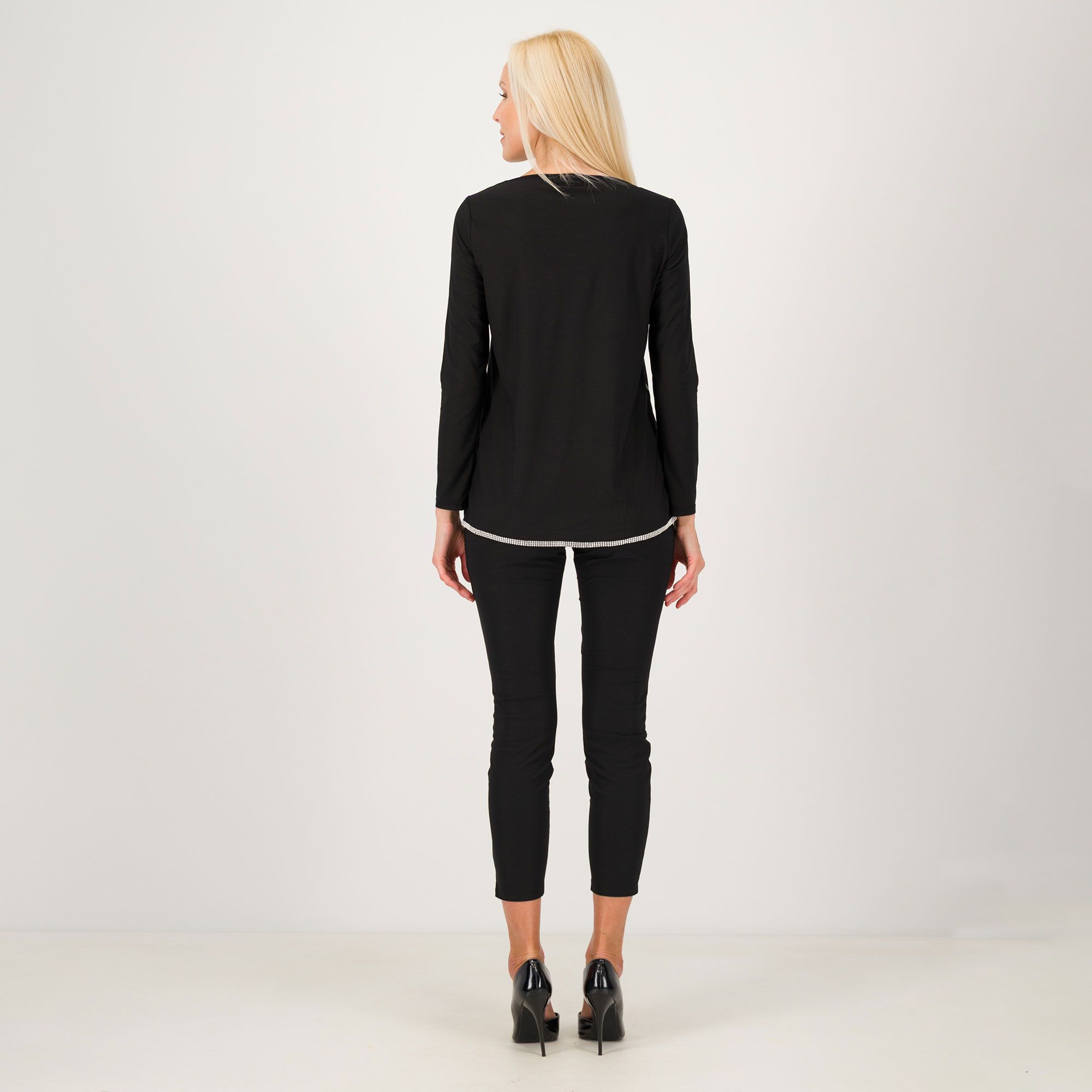 • maglietta a maniche lunghe con scollo tondo ampio e motivo a petalo al fondo con bordo in strass