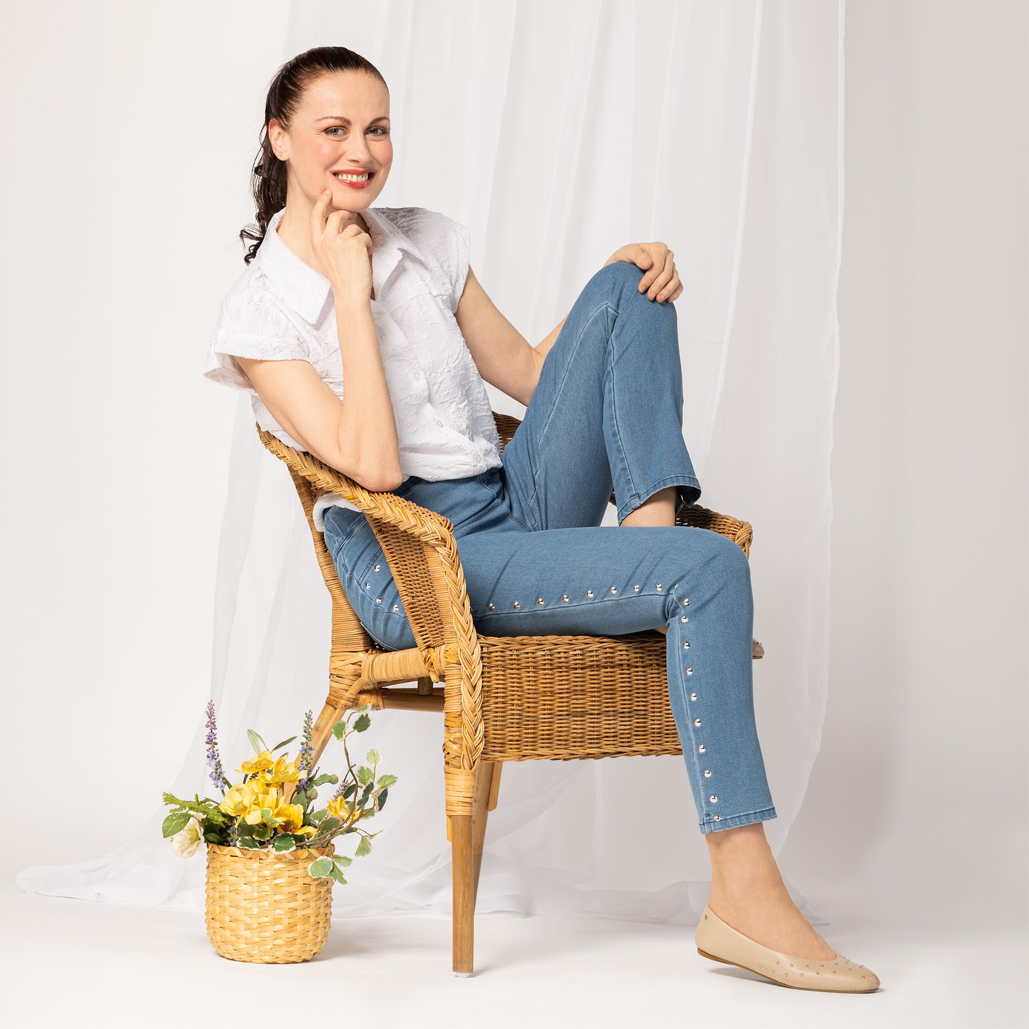• le borchie lungo le tasche e il profilo gamba aggiungono un tocco grintoso e contemporaneo