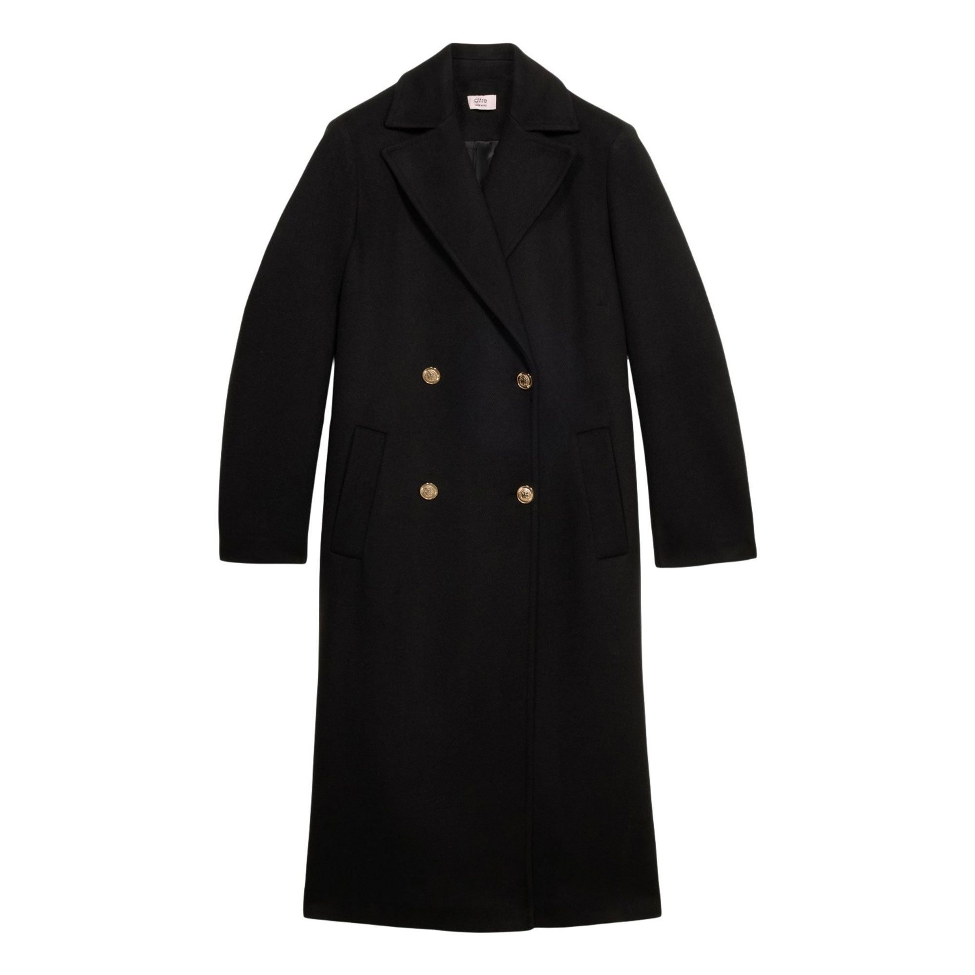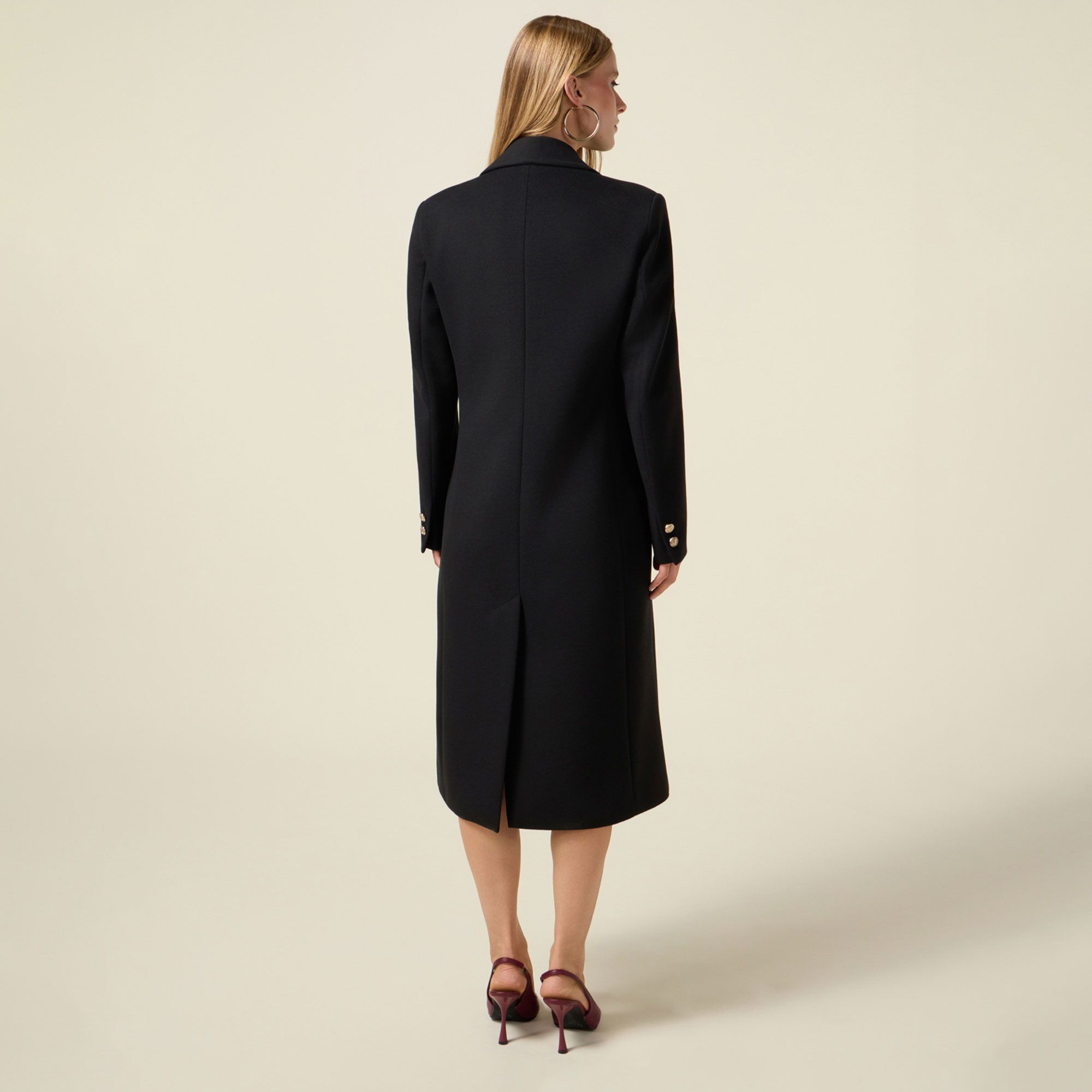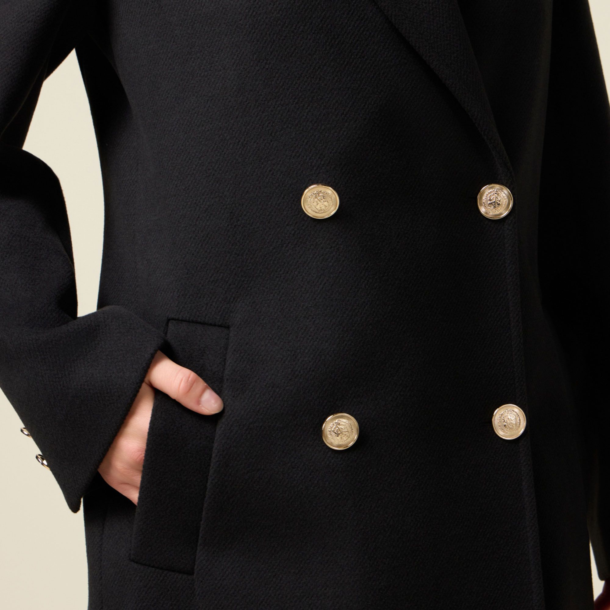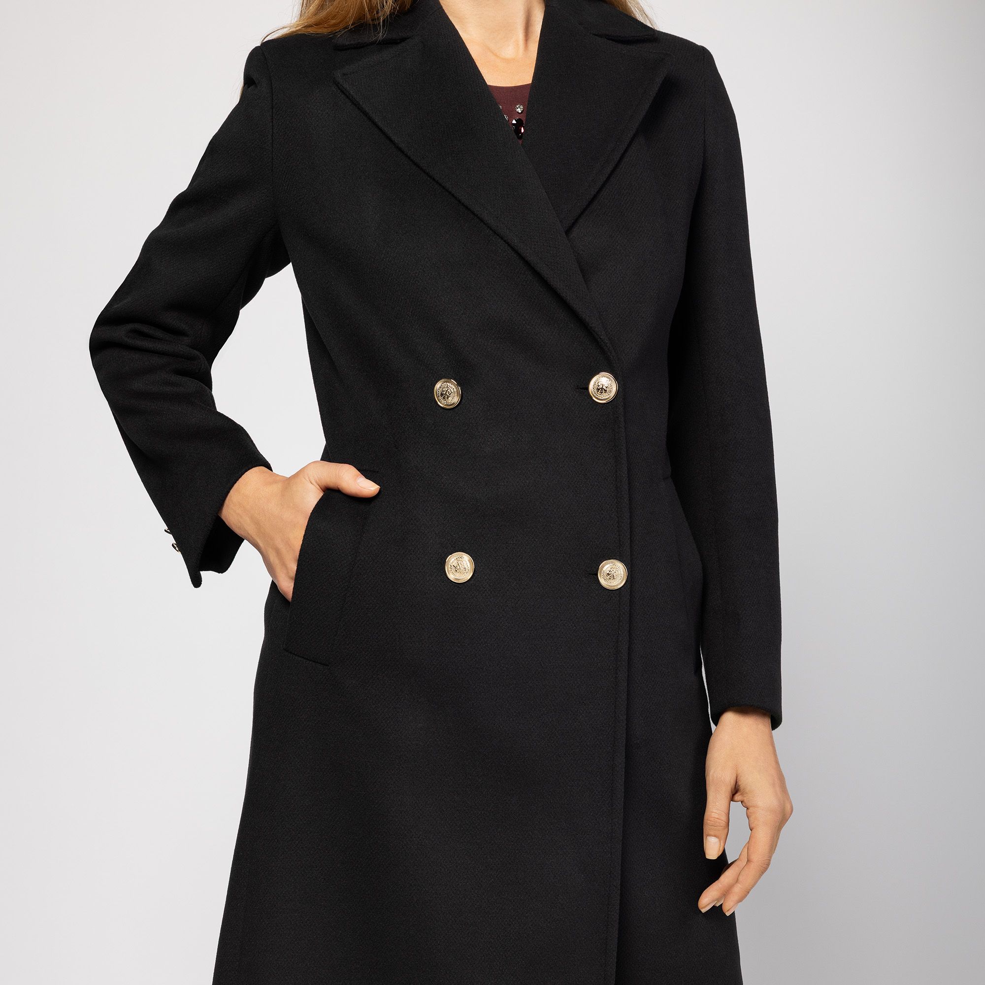 • chiusura doppiopetto con bottoni metallici in stile uniform