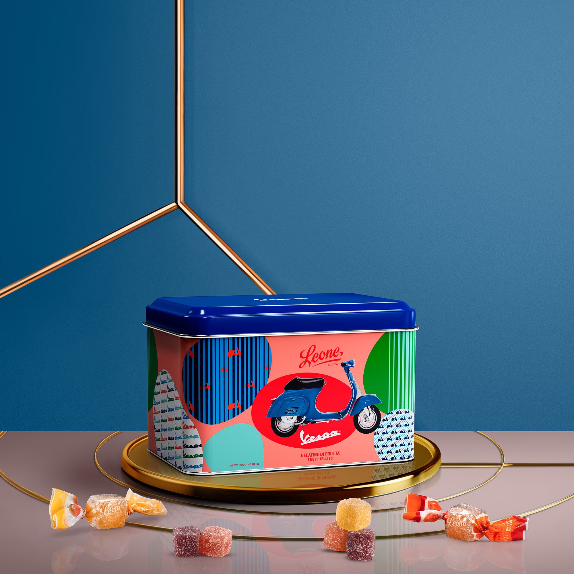 • gelée alla frutta assortite (200 g): morbide caramelle alla frutta, dal gusto intenso e avvolgente, confezionate in una latta regalo dal design Vespa
