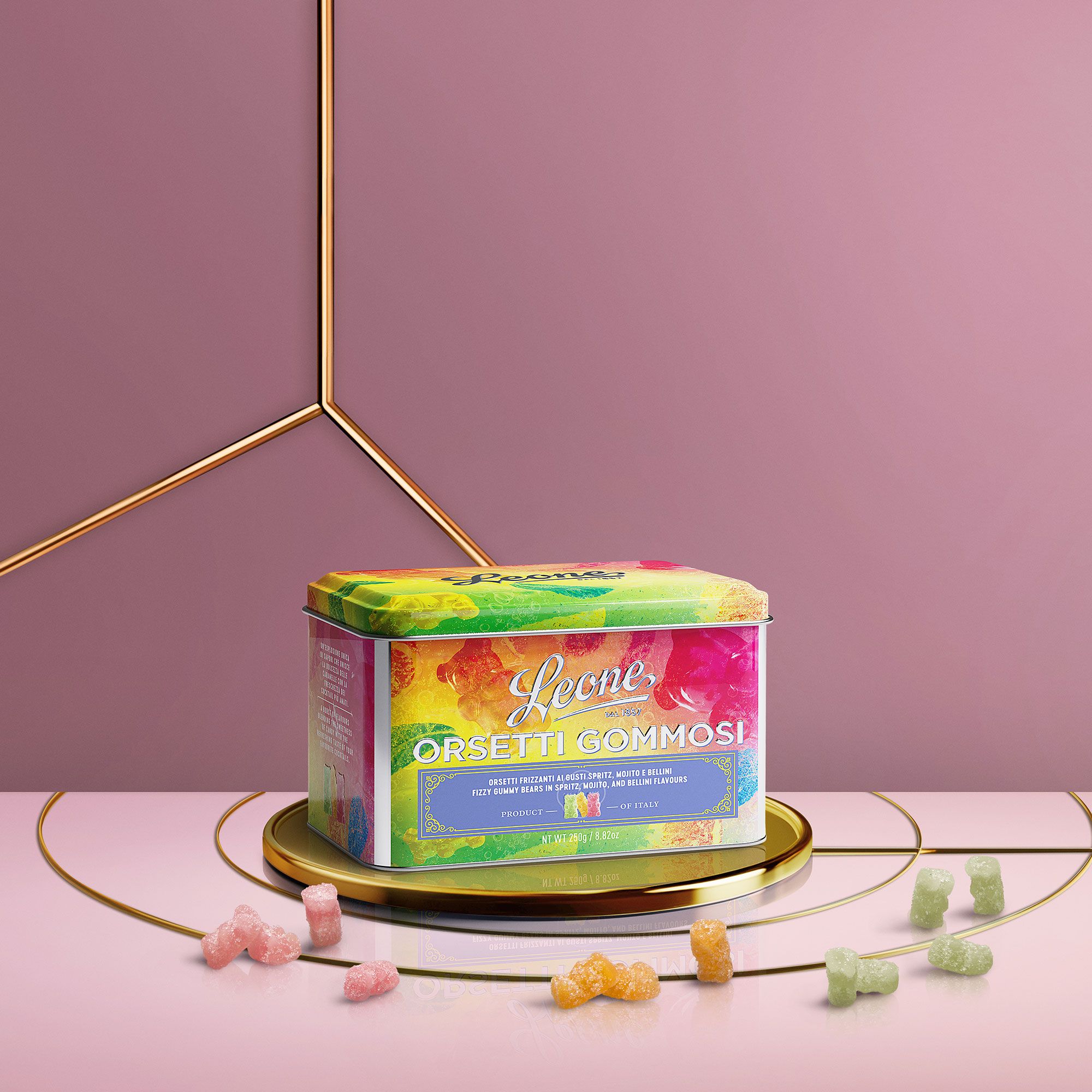 • latta regalo orsetti cocktail (250 g): caramelle gommose a forma di orsetto, nei gusti ispirati a celebri cocktail come Mojito, Spritz e Bellini