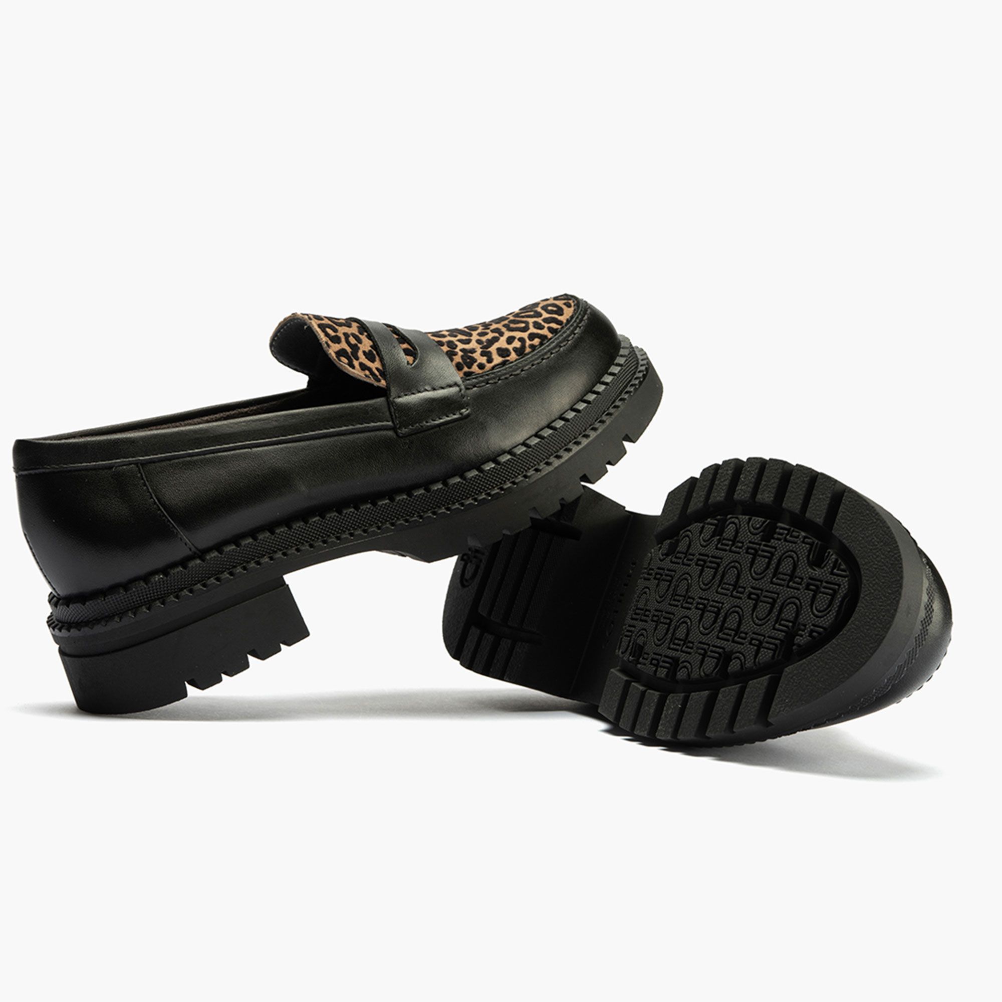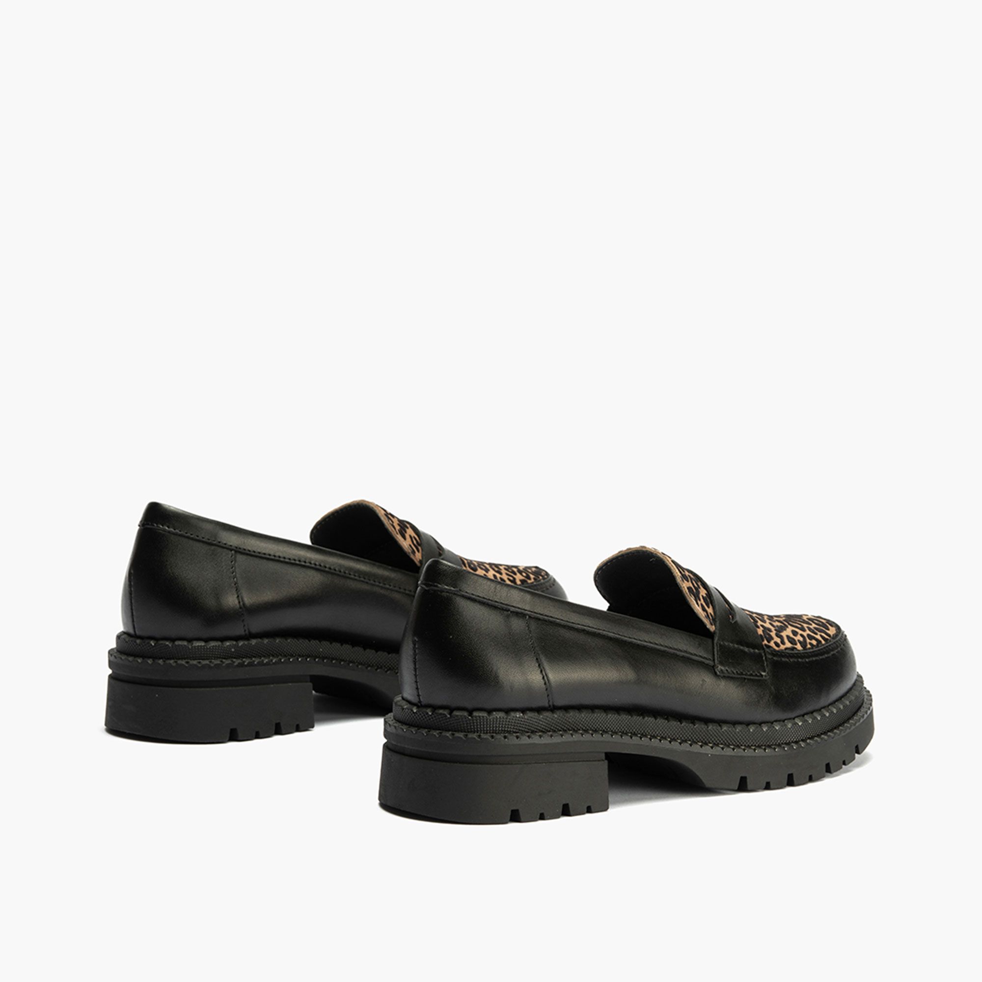• mocassini in pelle con fascetta frontale e vaschetta a contrasto in pelle stampa leo