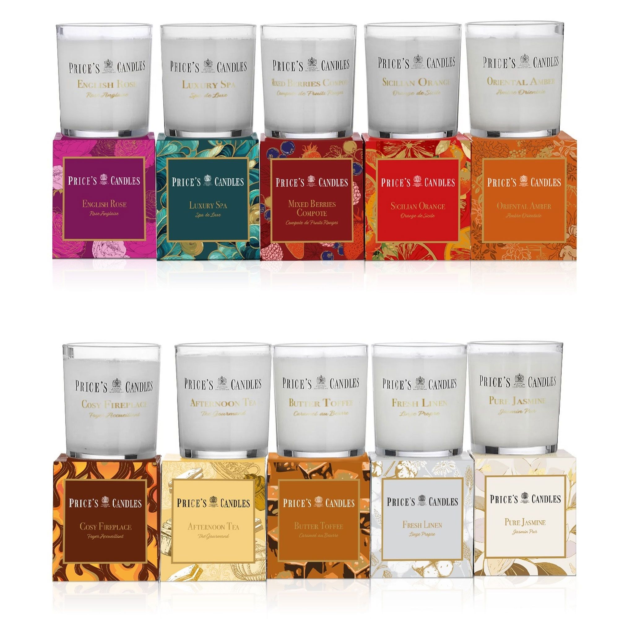 Set 10 candele in confezioni regalo con astuccio in cartoncino, fragranze assortite (170 g cad.):
