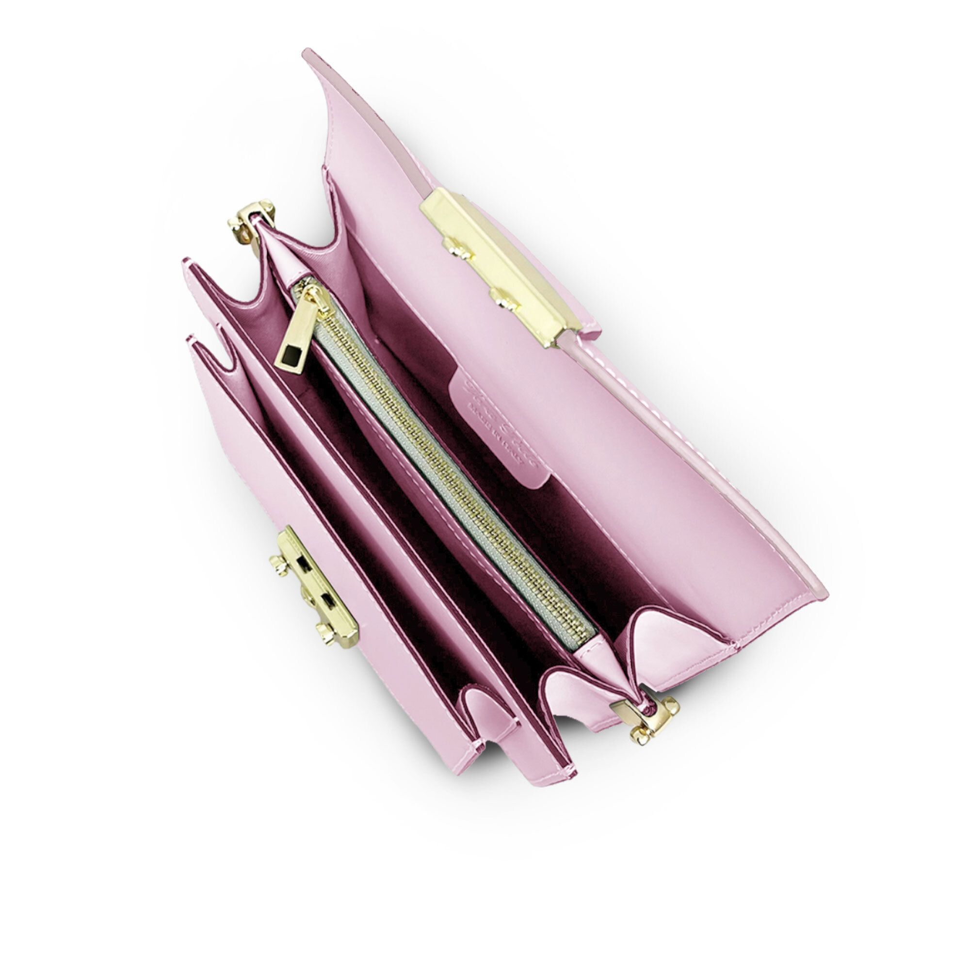• interno foderato e diviso in due scomparti, separati da una tasca con zip