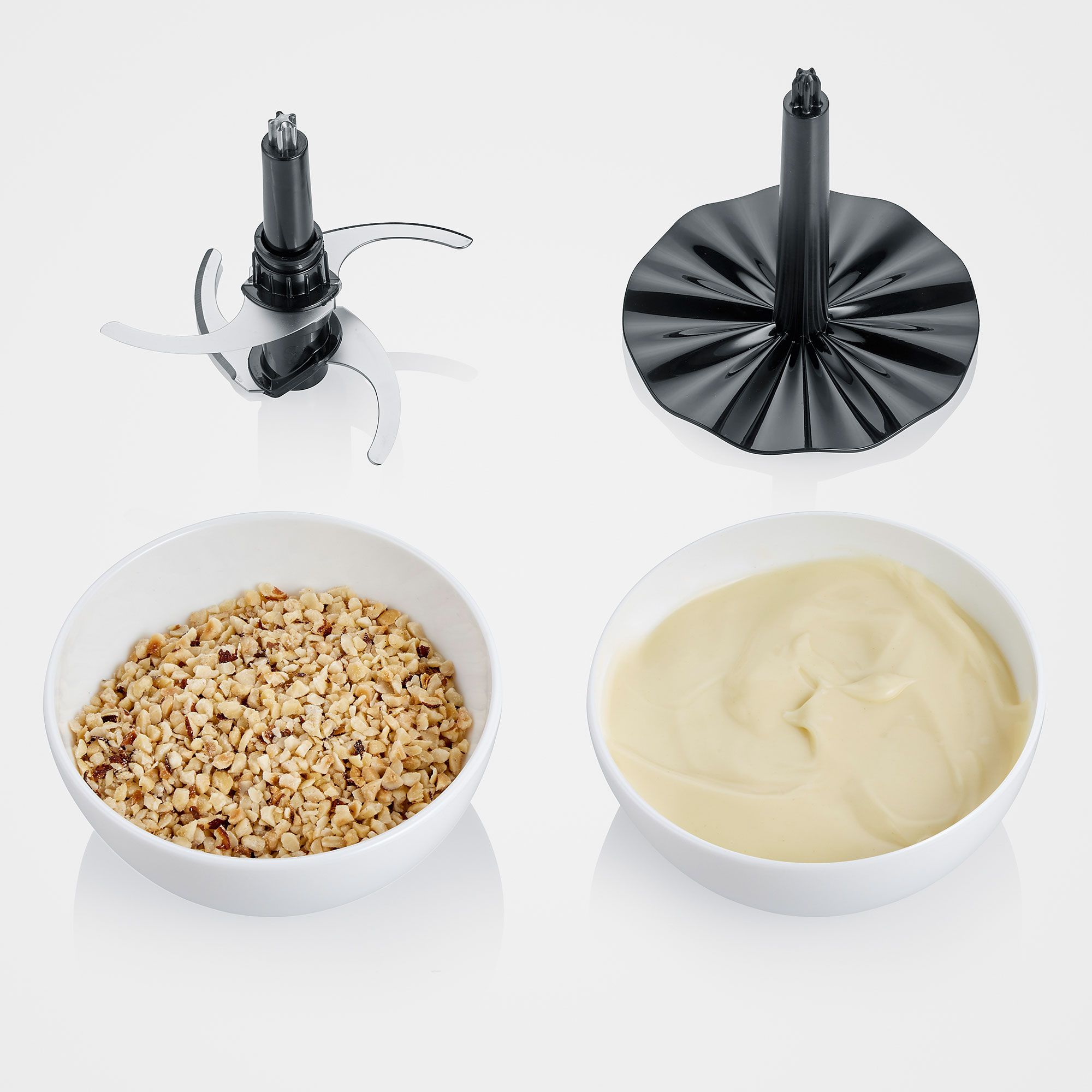 • l’inserto a 4 lame su due livelli assicura un taglio uniforme e preciso su erbe, cipolle, carne, formaggi, frutta secca e ghiaccio