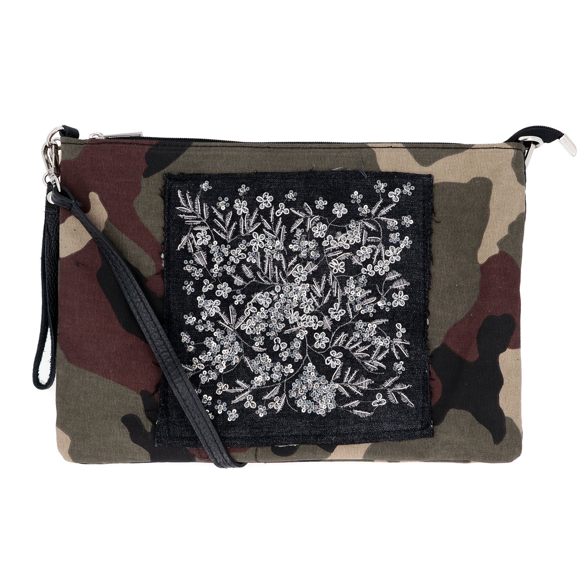 • la variante camouflage presenta un ricamo floreale argentato, la variante verde un ricamo con stella marina con cristalli e perle, la variante denim un ricamo con strass e cristalli incolori