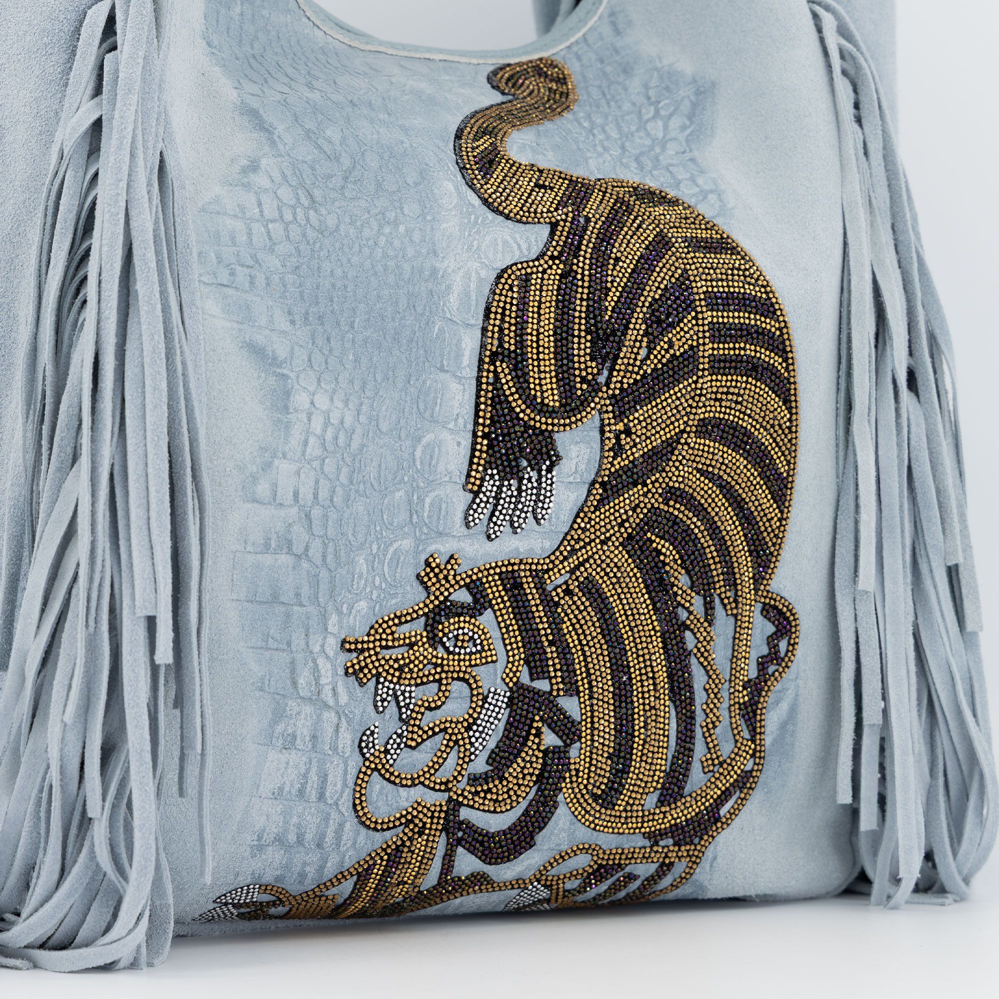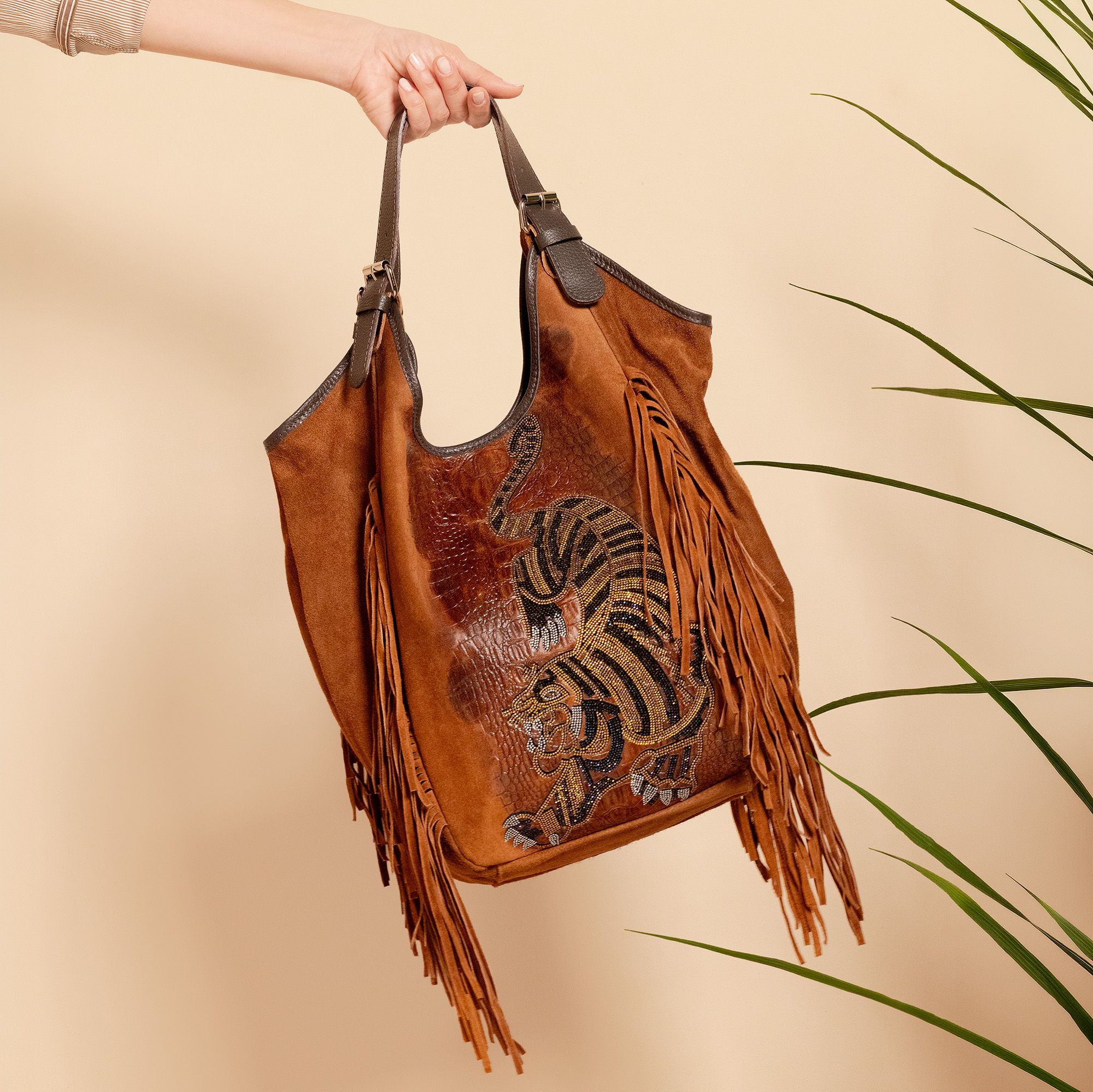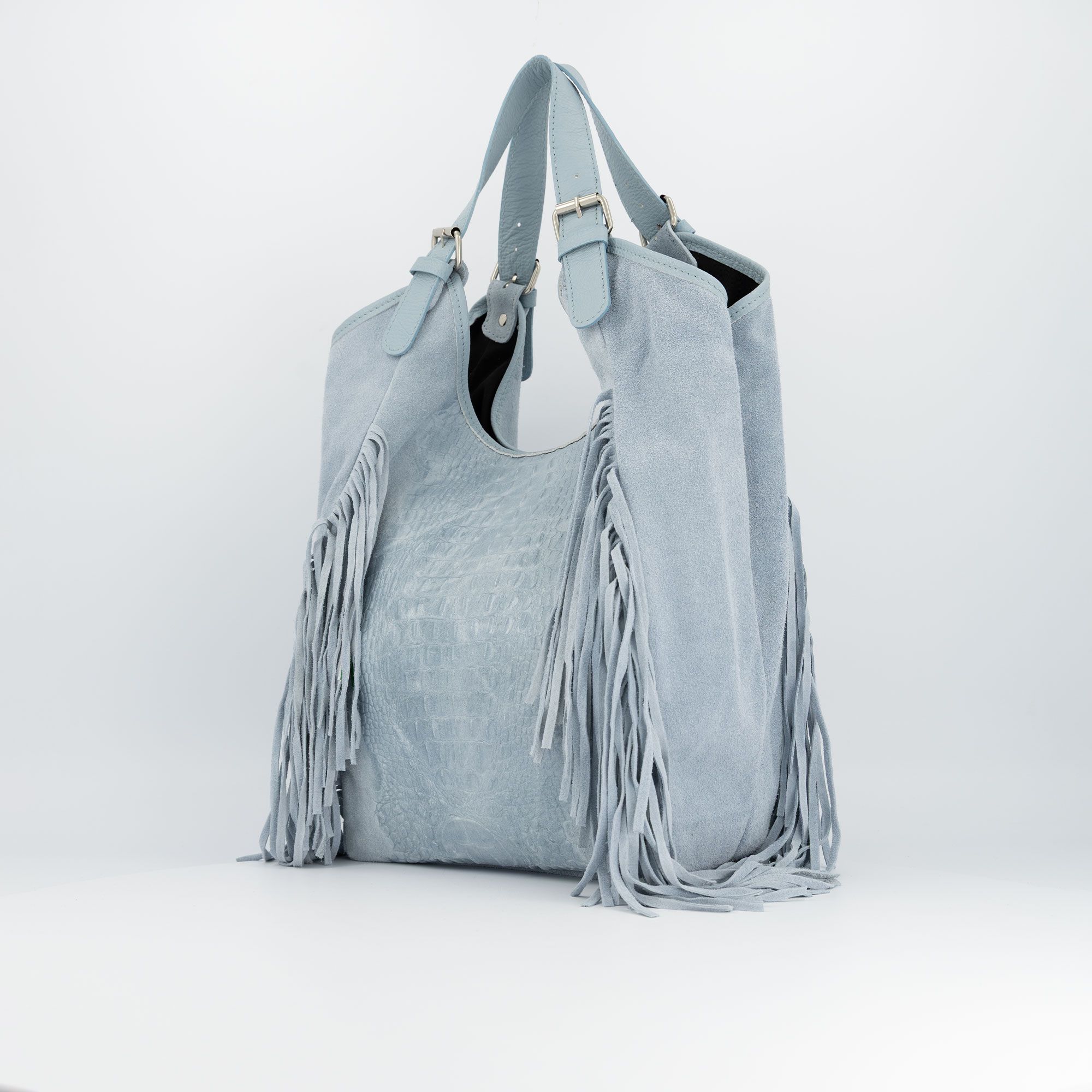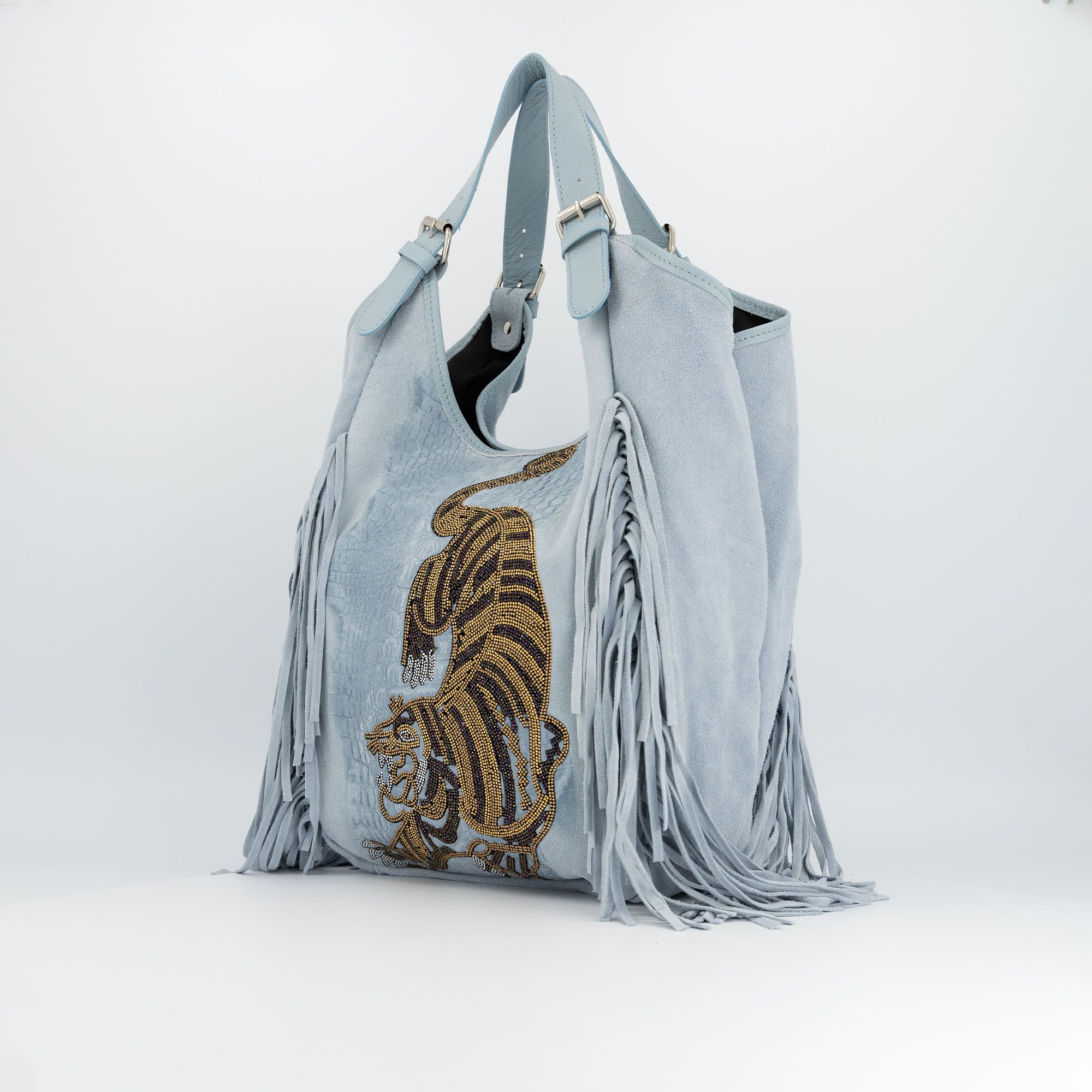 • borsa a spalla in pelle scamosciata con inserto centrale stampa cocco su fronte e retro