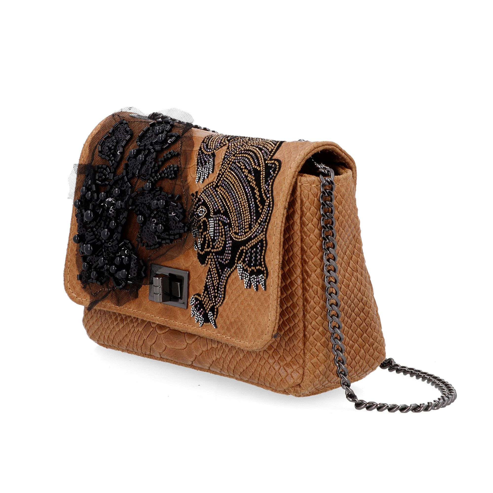 Una borsa che unisce personalità e dettagli preziosi, perfetta per dare carattere ai tuoi look serali e alle occasioni speciali. Il mix di applicazioni la rende unica e inconfondibile.