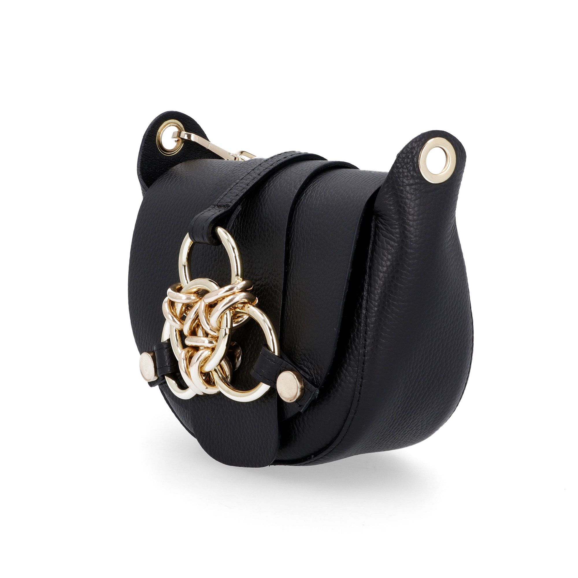 • fascia centrale sopra la patta con anelli metallici intrecciati decorativi, fissati con fascette e borchie