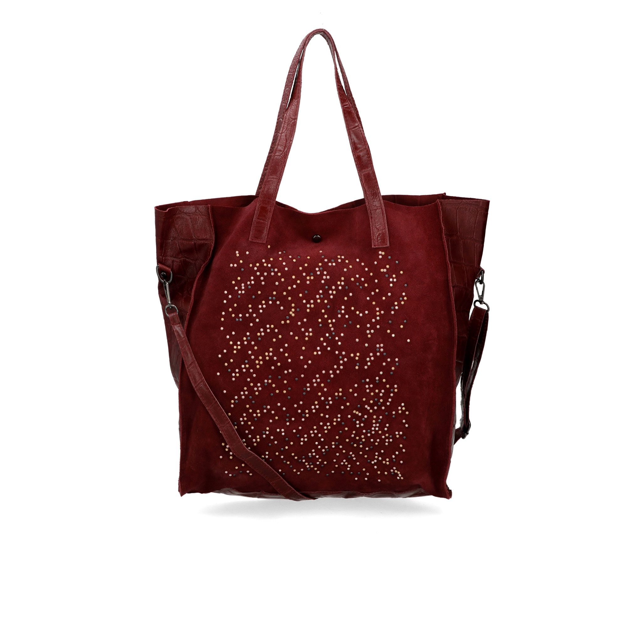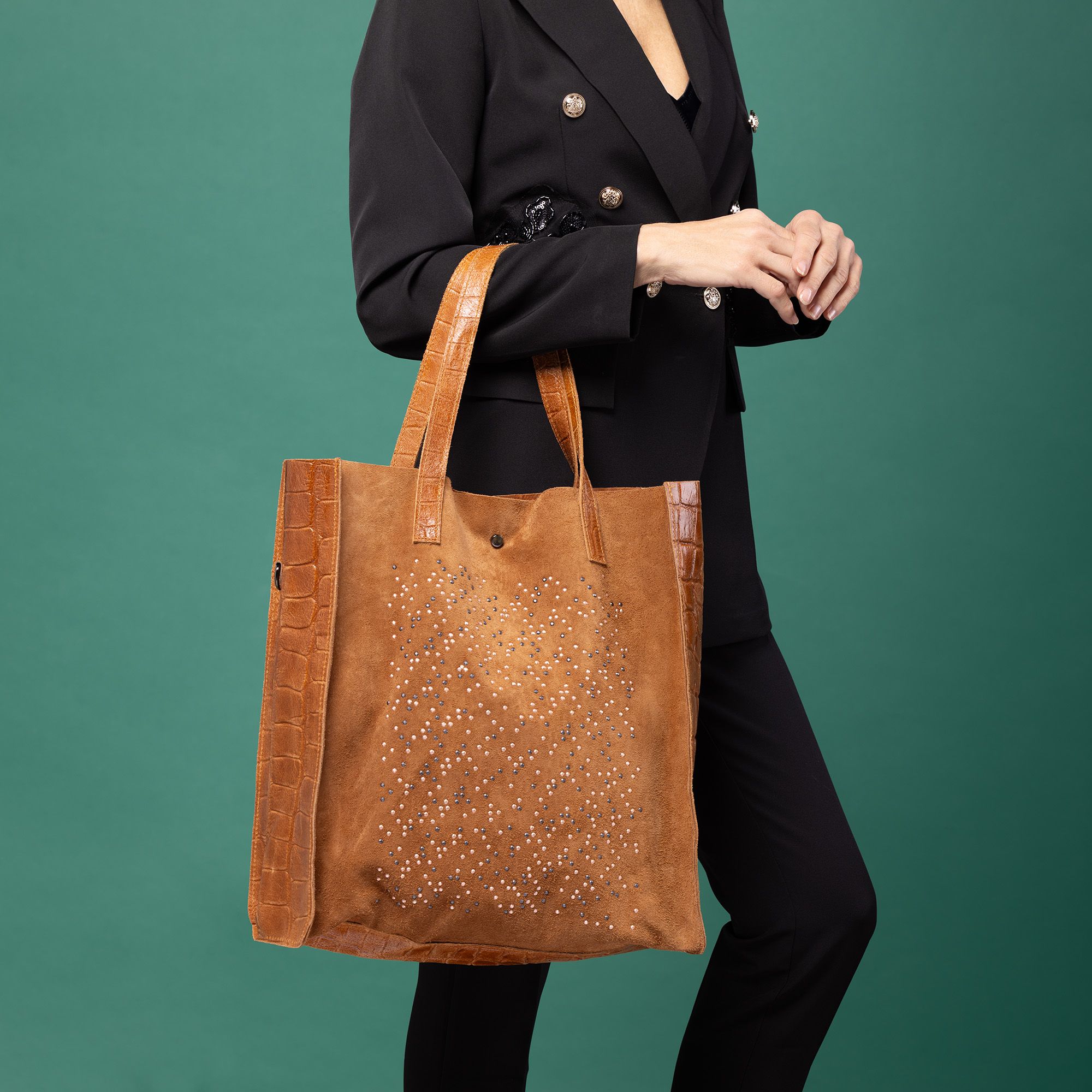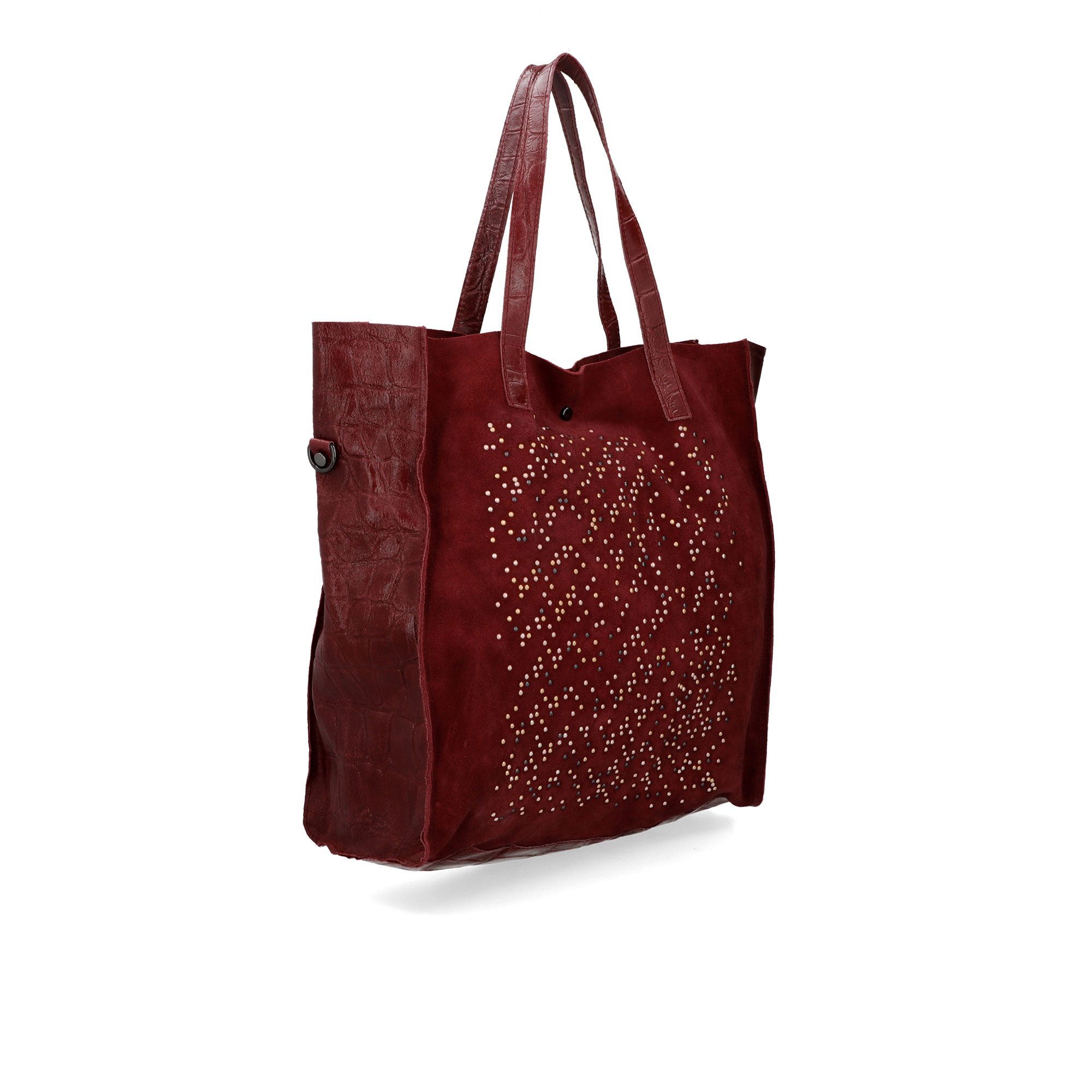 • pannello laterale in pelle scamosciata con borchie sfaccettate applicate con tecnica termoadesiva