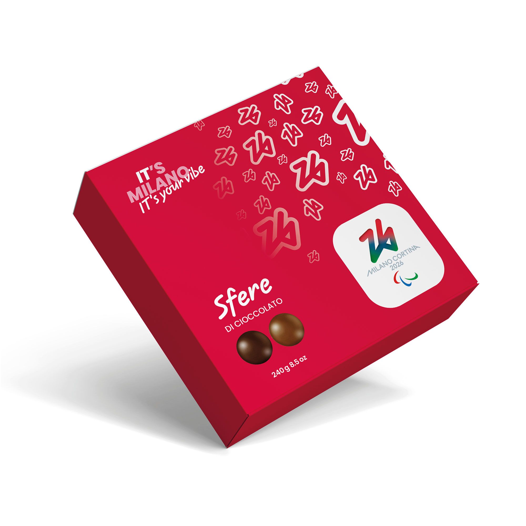 • confezione da 20 sfere assortite di cioccolato al latte e fondente (240 g): sfere di cioccolato fondente ripiene di crema al cacao e sfere di cioccolato al latte ripiene di crema al latte